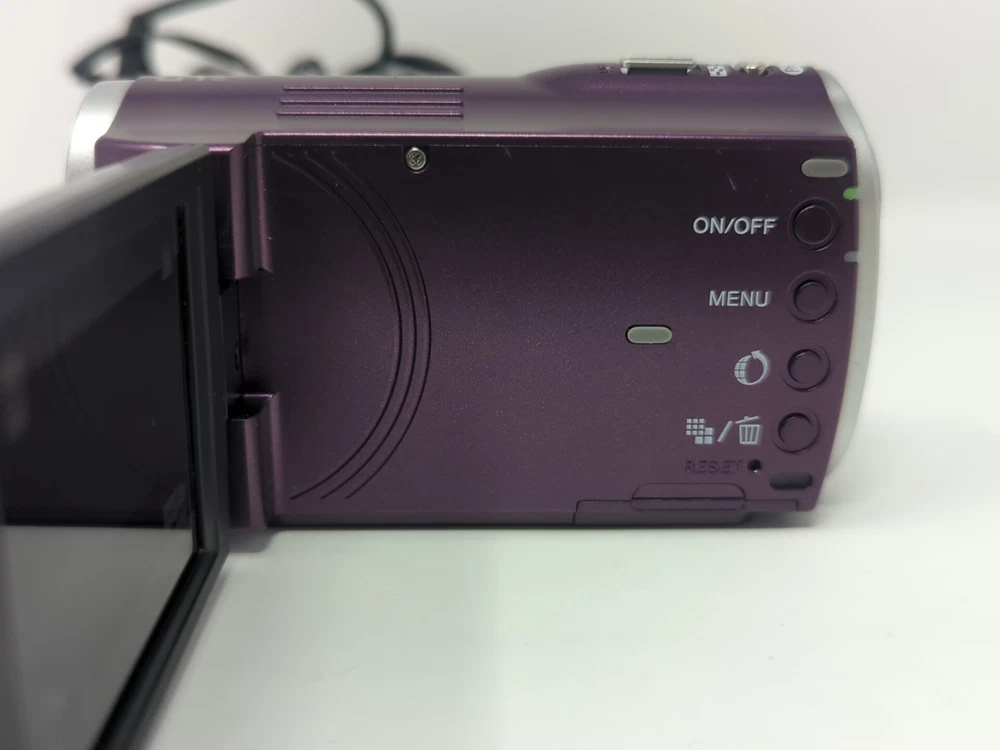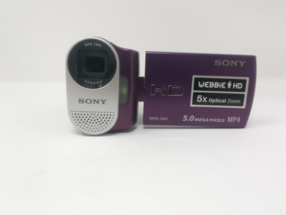 Camera works and has a few cosmetic flaws as shown in the photos, comes with the charger, no sd card The Sony MHS-CM1 HD Camcorder is a compact and portable device perfect for capturing high-definition videos. With a sleek purple design, this camcorder offers 5x optical zoom and HD recording capabilities. It uses SD media format for storage, making it easy to transfer and store your videos. The compact size of this Sony Handycam model makes it convenient to use and perfect for capturing special moments on the go. Made in Japan, this camcorder is a reliable choice for anyone looking to record in HD quality.
