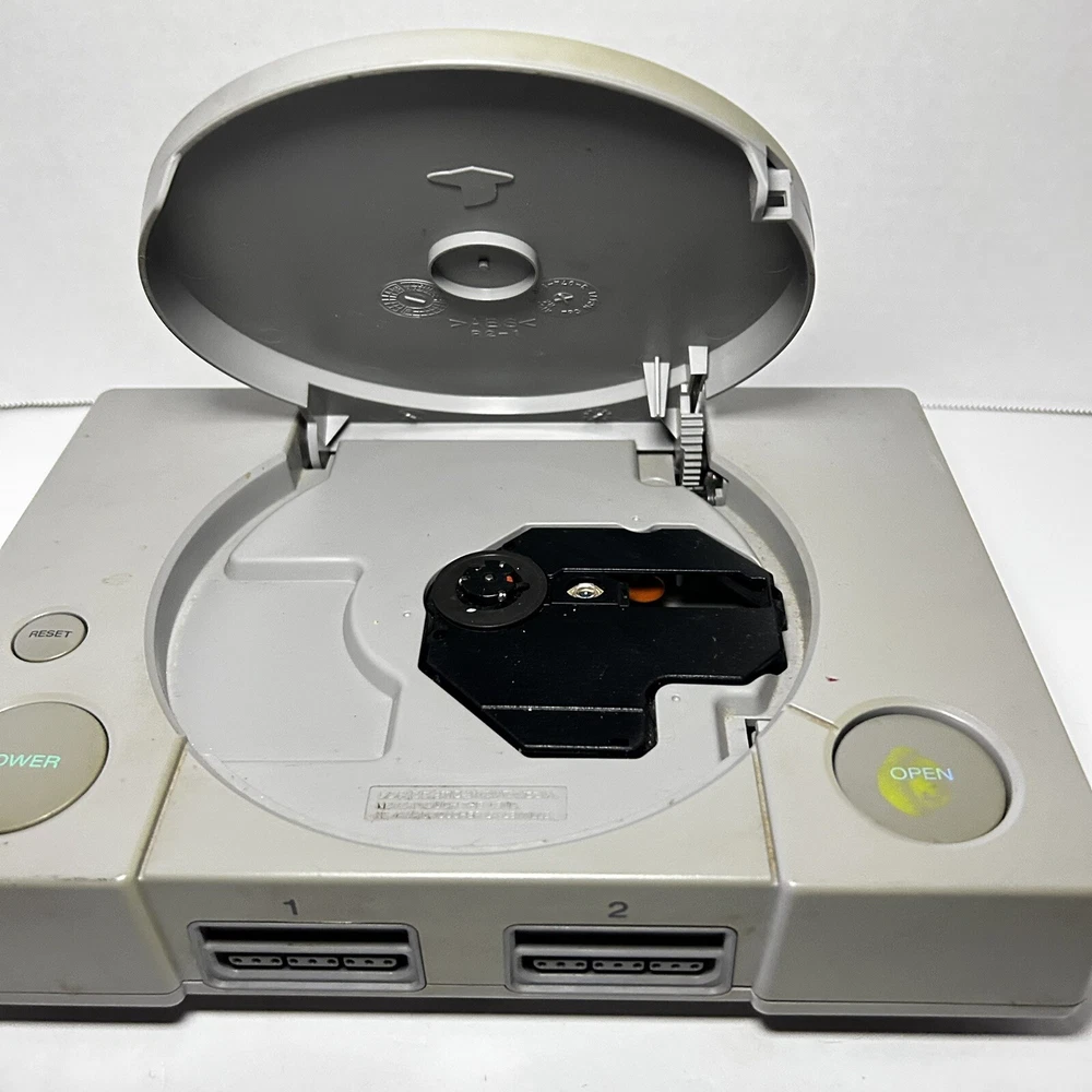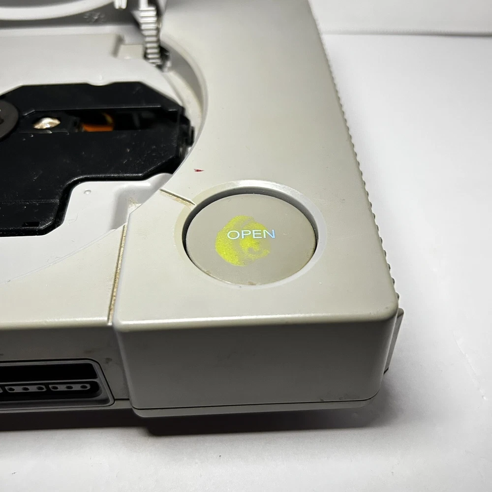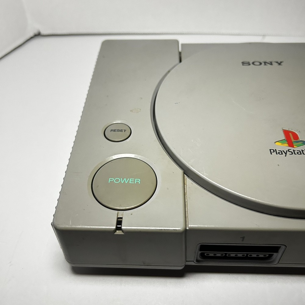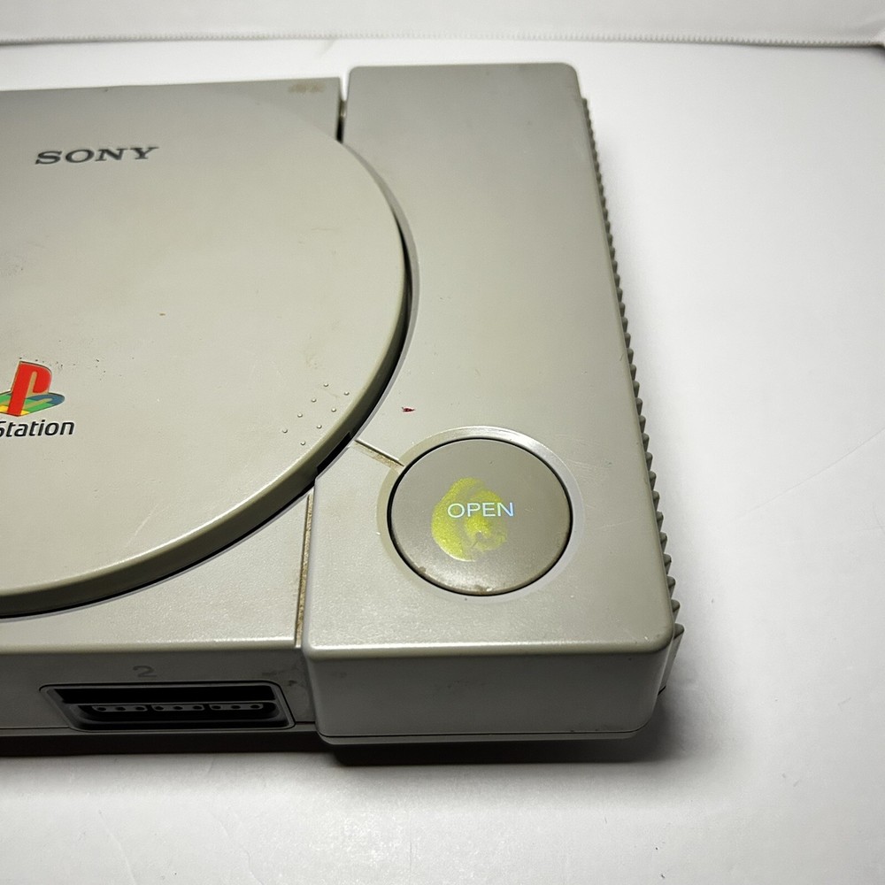 This is a Sony PlayStation 1 console (model SCPH-9001) manufactured in 1999 in Japan. The color of the console is gray. It is being sold for parts or repair. The listing includes only the console itself, no additional accessories are mentioned. Untested with a mark on the open button. Open button also gets stuck causing door not shut