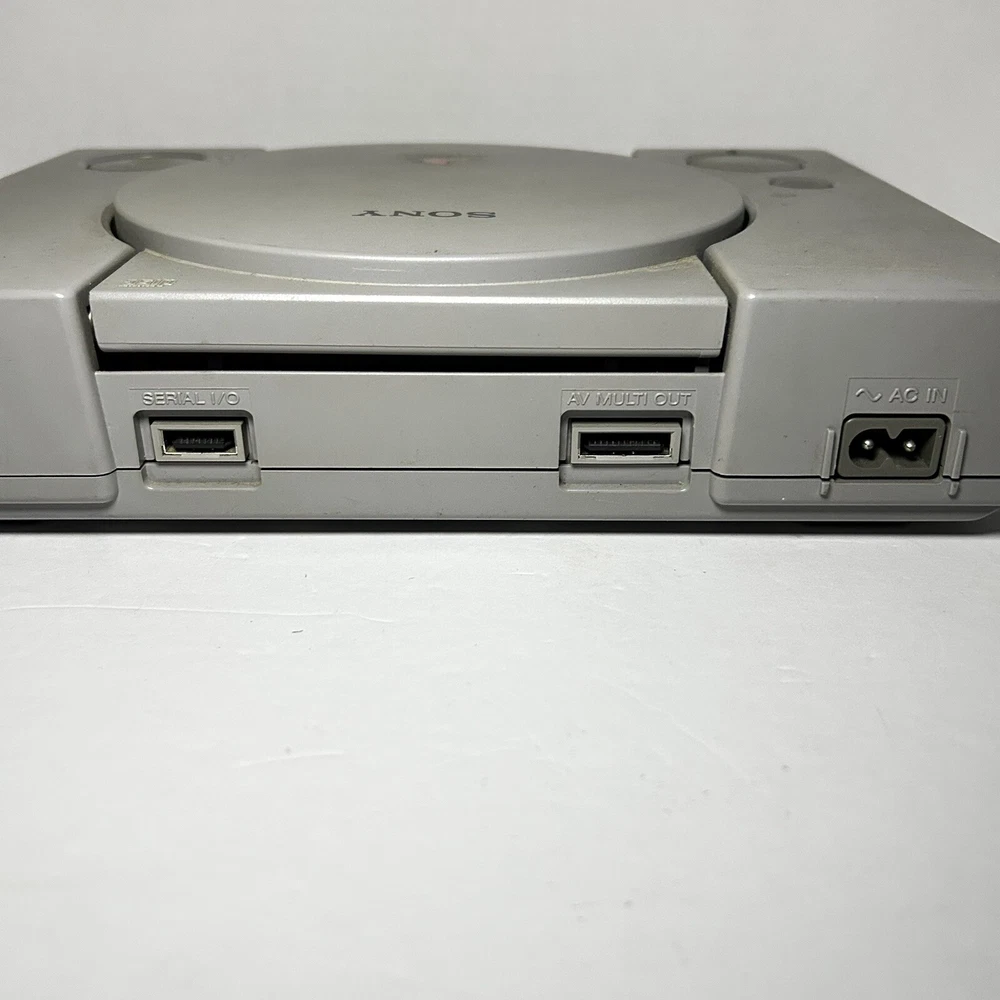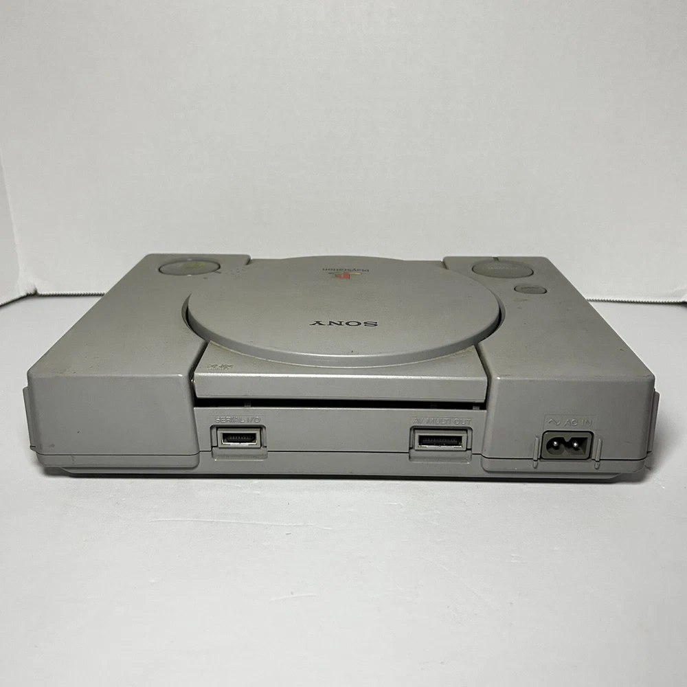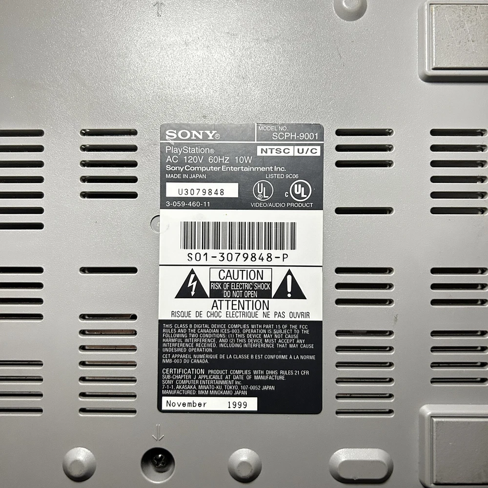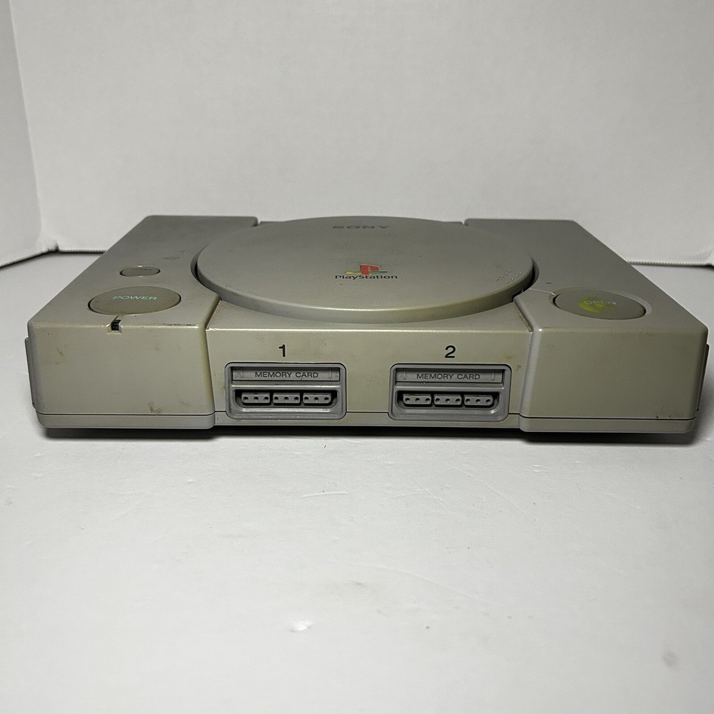 This is a Sony PlayStation 1 console (model SCPH-9001) manufactured in 1999 in Japan. The color of the console is gray. It is being sold for parts or repair. The listing includes only the console itself, no additional accessories are mentioned. Untested with a mark on the open button. Open button also gets stuck causing door not shut