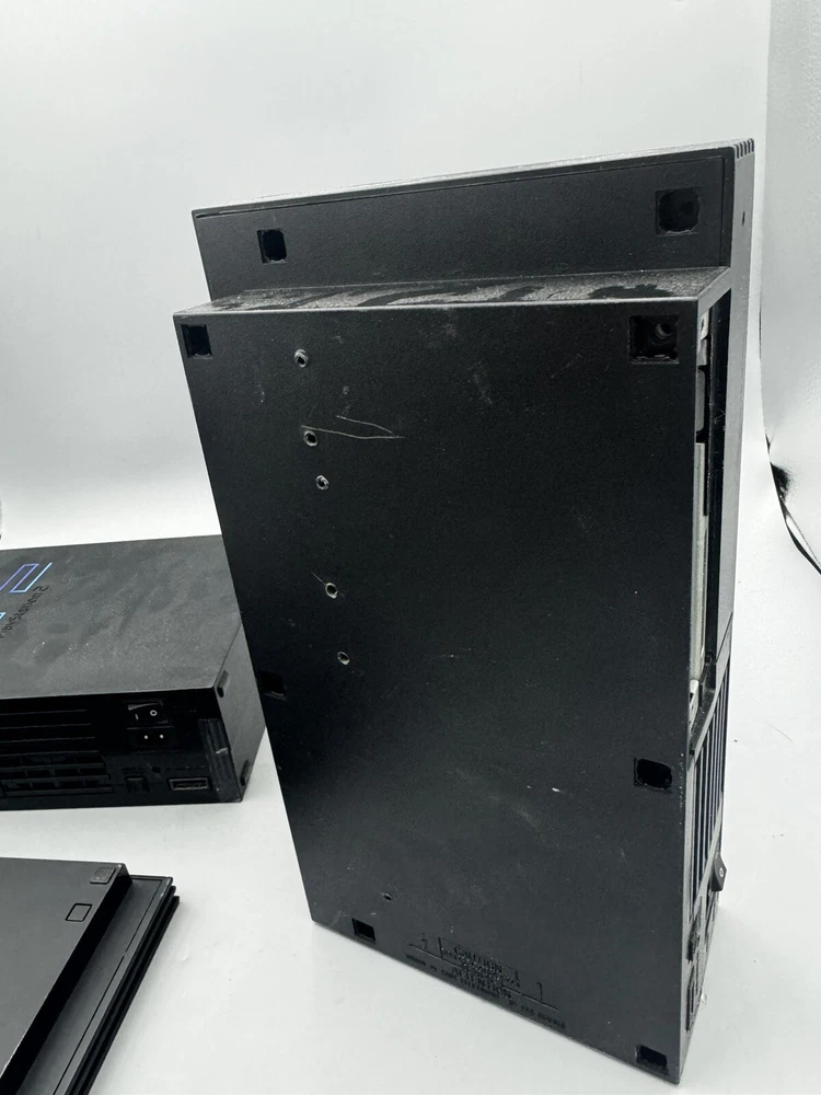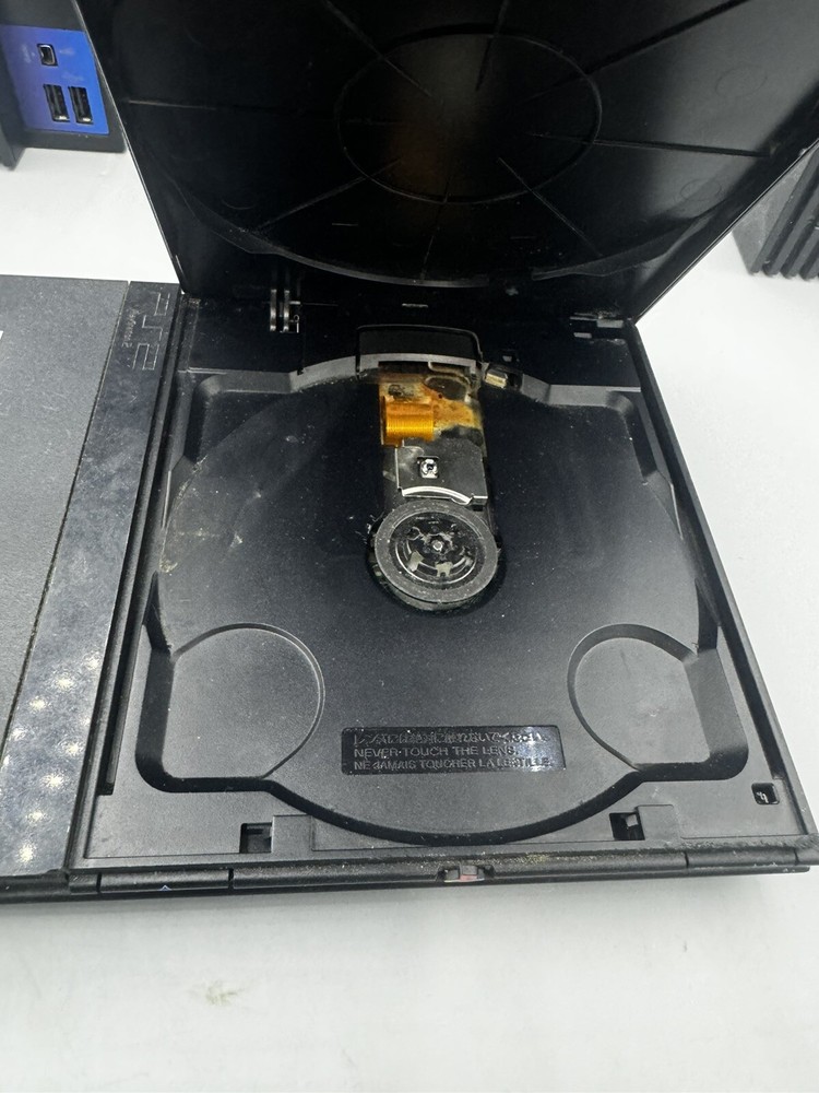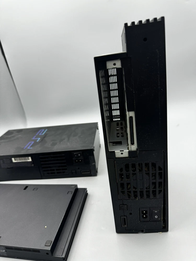 SOLD AS IS WHERE IS I received these In a large lot I recently acquired but do not have the time or desire to go further. The slims housing is damaged. It boots on but requires a new laser assembly at the minimum. As shown the disc lid is broken and comes loose, the back housing is damaged. The one fat turns on but doesn’t read discs, i don’t hear the fan turn on either. The last fat I didn’t even bother. The disc drive is missing the top cover as shown in the images, the housing has holes in the bottom and the top is mangled.