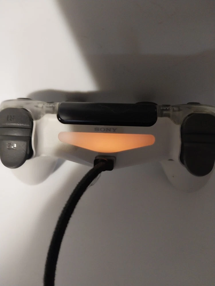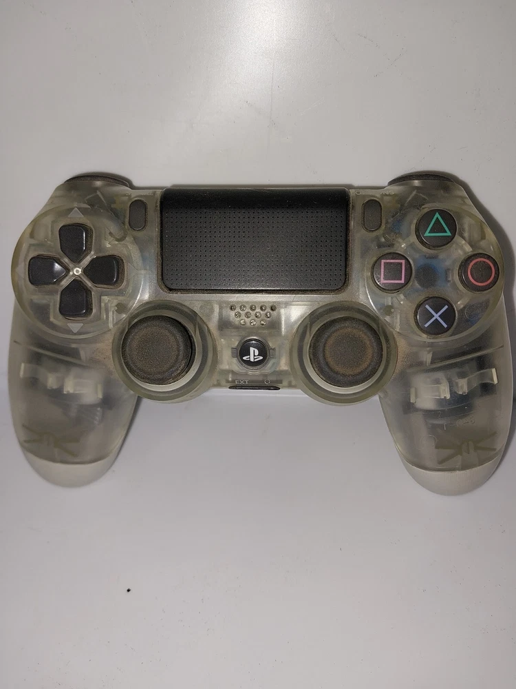 This is a Sony PlayStation 4 Crystal Clear DualShock controller, compatible with the PS4 console. It is wireless with a range of 5-10m and features a padded design for comfort during gameplay. This OEM controller by Sony is made of plastic and weighs 0.75lbs. It has a maximum of one player and includes one fan for cooling. Testedcharging light comes on when connected.
