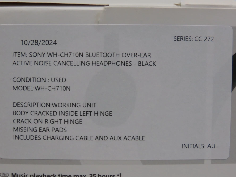 Sony WH-CH710N Wireless Bluetooth Noise Canceling Headphones (BROKEN) Functional Condition: Tested and Functional With Issue. ISSUE: Body Cracked Inside Left Hinge. Crack On Right Hinge. Missing Ear Pads. Cosmetic Condition: This is a Used Item and Normal Wear (Scuffs & Scratches) is Expected. Items included in this listing: HEADPHONES CHARGING CABLE AUX CABLE Items NOT included in this listing: N/A Thank you for Shopping with Us! ENJOY Free Shipping in USA & Low Cost Shipping to CANADA! Terms of Sale NOTE: Our Listings only include items as pictured - Please do not assume any item is included if its not pictured. We will try our best to picture all items included in this listing as well as its cosmetic condition. We Guarantee & Stand Behind our product and commitment to provide you with o nly Original, Branded, OEM & Genuine Products Shipping A complete and correct shipping address is essential. We cannot guarantee the shipping address can be changed after checkout. Sales Tax will be charged to all Canadian & USA Buyers. Combined shipping is not guaranteed. We are unable to change any content of your order based on the eBay checkout note or PayPal message. Customers with shipping addresses outside of the U.S.A and Canada are responsible for all duties and import taxes. Please contact your customs for information Bidding All items are accurately described and pictured. Please ensure you are consciously bidding on the items as described. Payment Payments are expected at the time of purchase or in case of Auctions, at the end of auctions. Payments are managed via eBay Managed Payments Contact Us Your positive feedbacks are extremely valuable to us. If you have any concerns about your order, please contact us through eBay message to resolve any issues before leaving a negative feedback or opening a dispute. We will reply within 24 Hours Return Policy All items are in used condition unless specified.