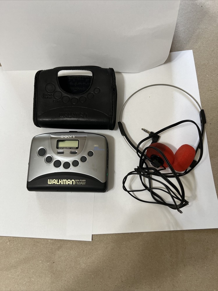 This Sony Walkman WM-FX251 is a portable audio device that features a digital tuner with 20 presets, auto reverse, AVLS, headphone jack, and a cassette tape player. It is made in Malaysia and has a silver and dark gray color. The device is a part of the Walkman product line and is compatible with AM/FM bands. The Sony WM-FX251 has a normal/CrO2 metal tape selector switch and a belt drive. It also has audio outputs that include a headphone jack. The device is perfect for those who love listening to music on-the-go. Come with a leather case and headphone.