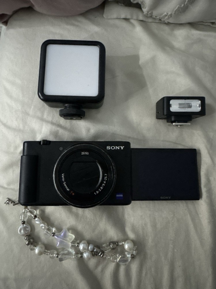 BASICALLY BRAND NEW- HAD FOR 1 YEAR- will include flash attachment bought separately off amazon. The Sony ZV-1 Digital Video Vlogging Camera in black is a compact camera designed for vlogging and video recording. With a maximum aperture of f/1.8 and 20.1 MP maximum resolution, it captures high-quality footage. The camera features a 44x digital zoom, 2.7x optical zoom, and 2160p UHD video recording capabilities. It also includes features like auto contrast balance, face detection, built-in Wi-Fi, and image stabilization. With a lightweight design and versatile connectivity options, this Sony ZV-1 camera is ideal for capturing professional-looking videos on the go.
