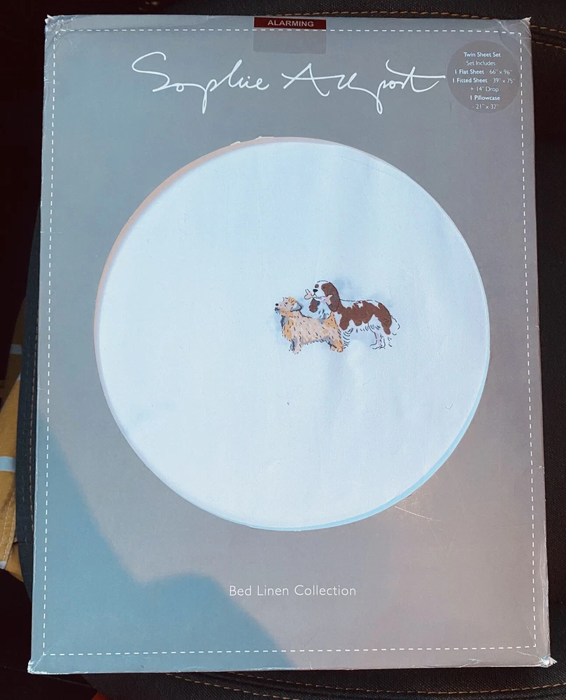 Make your bedroom feel like a cozy cottage with this Sophie Allport bed linen collection. The twin sheet set features a charming doggy daycare theme with adorable spaniel terrier designs in white. Made from high-quality linen material, this sheet set is machine washable and perfect for any dog lover. The set includes a flat sheet, fitted sheet, and pillowcase, all with a thread count of 200 or less. Add a touch of countryside charm to your bedroom with this delightful bedding set. See pics for measurements
