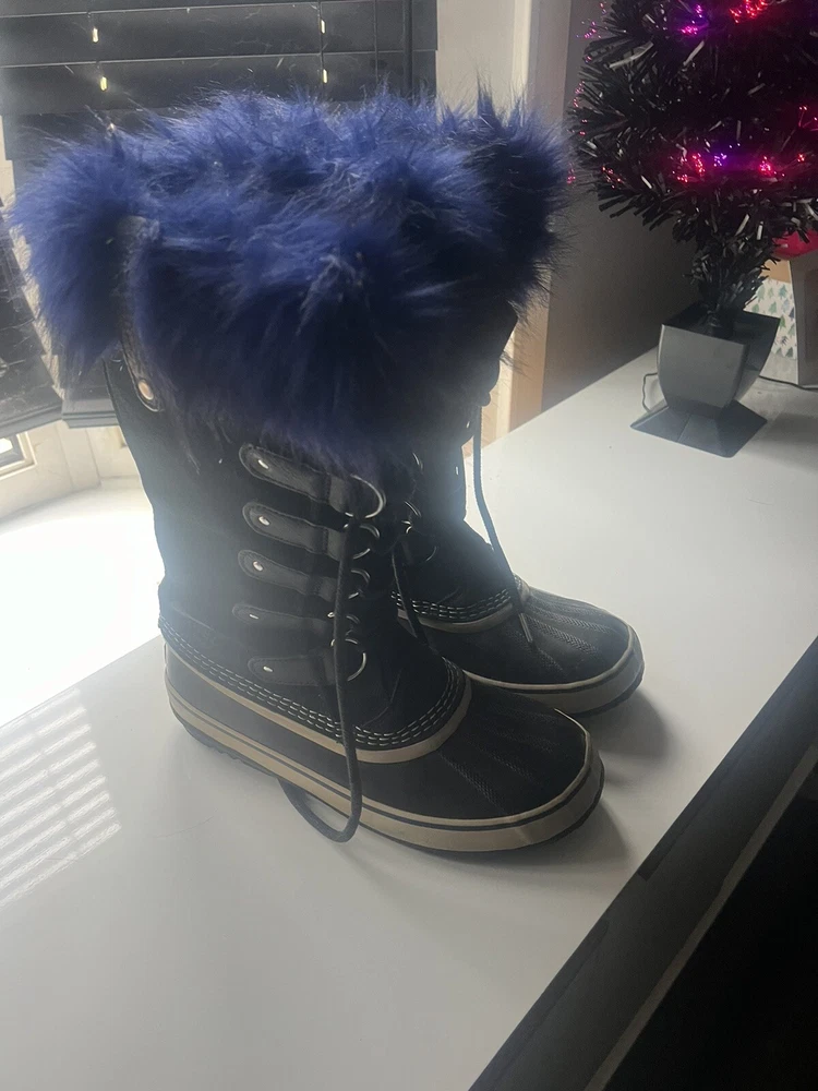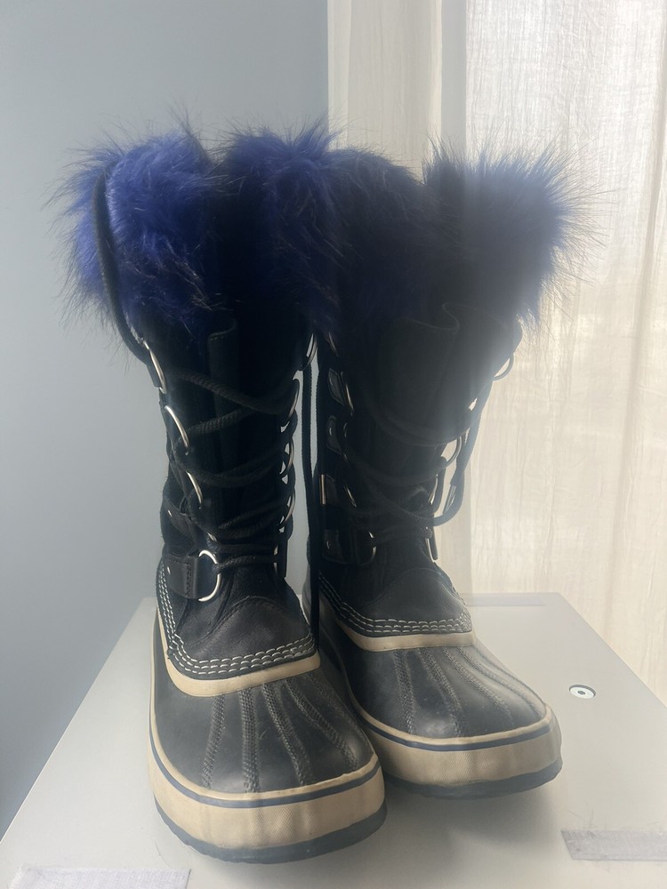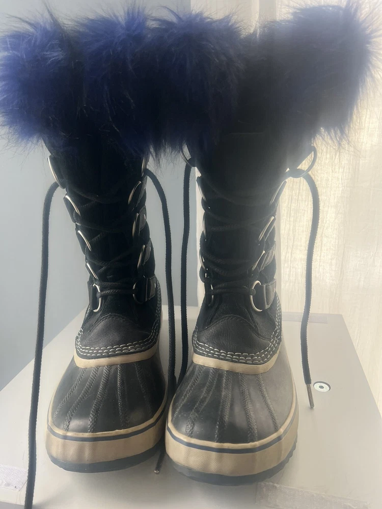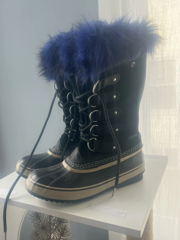Size 9.5 Cute with Boot Socks Warm and Dry Pairs well with Leggings Snow or Rain Boots RARE Blue Fur Pre owned work a few times Function and Style Step out in style and warmth with these Sorel Joan of Arctic Aviator Boots. The RARE blue faux fur upper material and round toe shape provide both fashion and function, while the lace up closure ensures a secure fit. These snow boots feature waterproofing technology, making them perfect for winter weather.