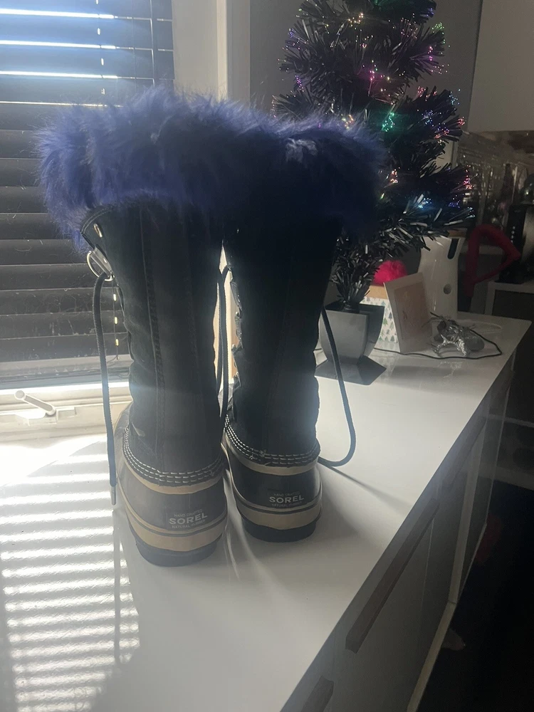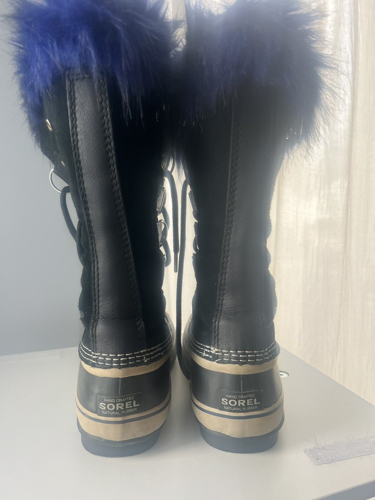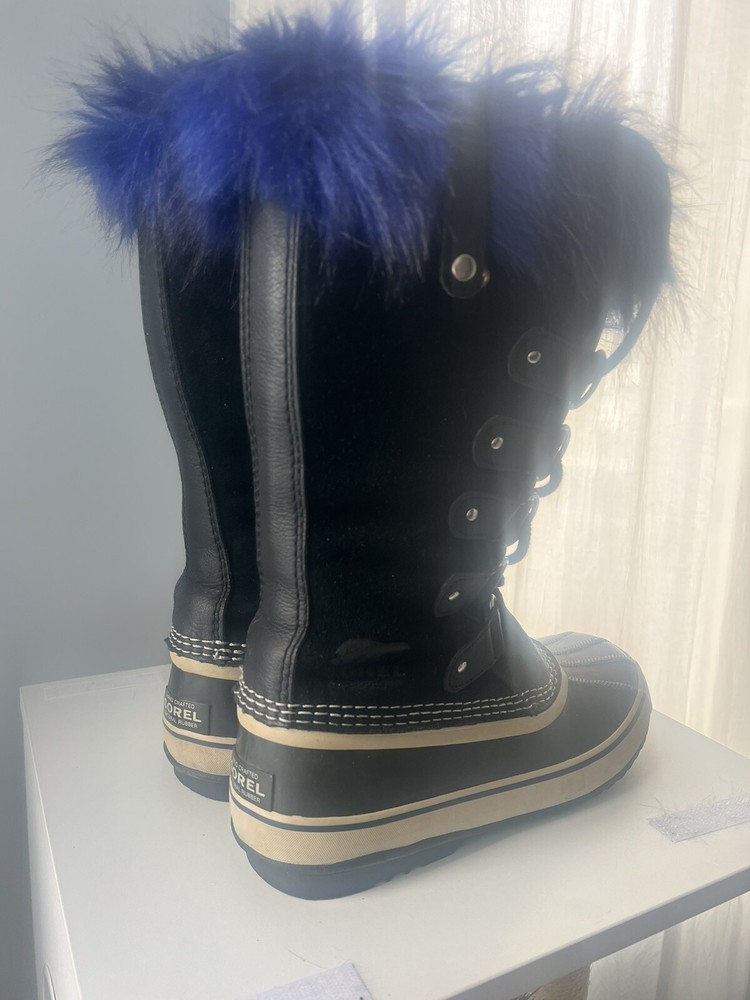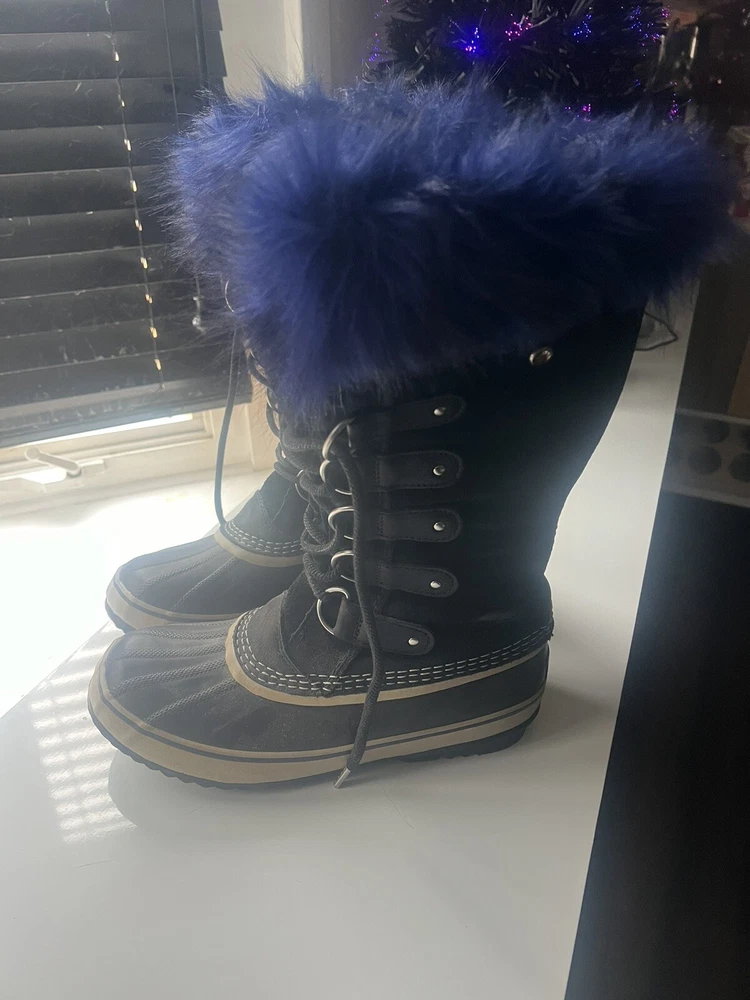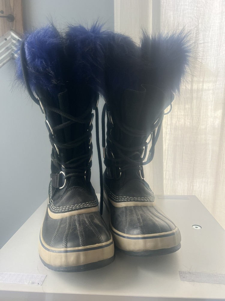 Size 9.5 Cute with Boot Socks Warm and Dry Pairs well with Leggings Snow or Rain Boots RARE Blue Fur Pre owned work a few times Function and Style Step out in style and warmth with these Sorel Joan of Arctic Aviator Boots. The RARE blue faux fur upper material and round toe shape provide both fashion and function, while the lace up closure ensures a secure fit. These snow boots feature waterproofing technology, making them perfect for winter weather.