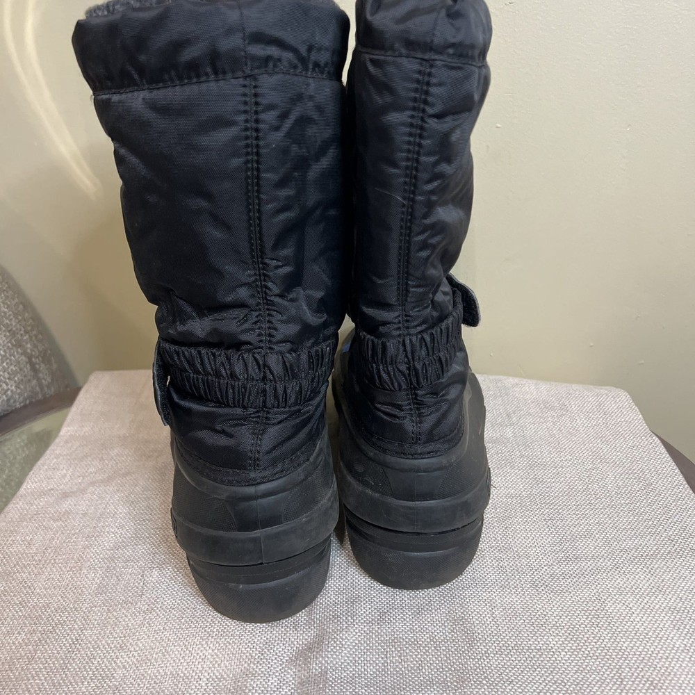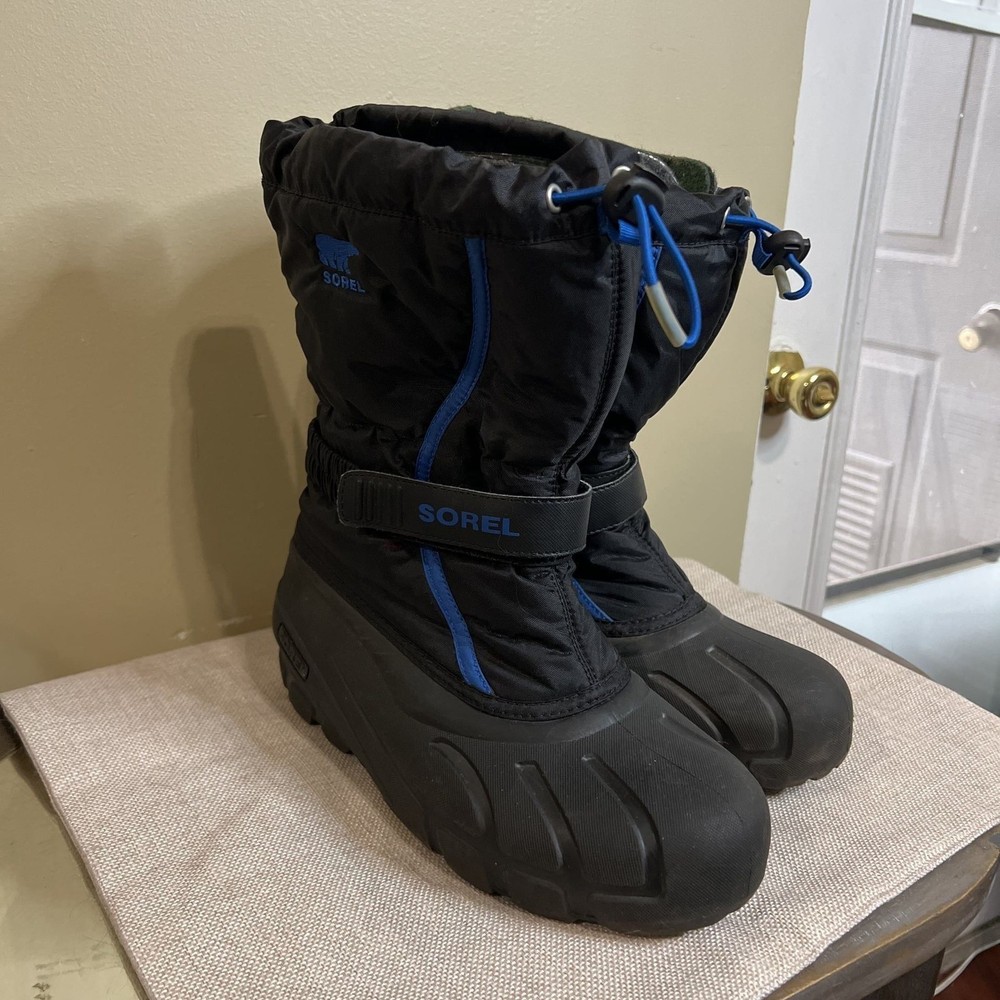 Sorel Youth Flurry Winter Boots, perfect for keeping young feet warm and dry in cold weather. These boots feature a durable black and blue exterior with a cozy lined interior for ultimate comfort. Designed for winter activities, they boast robust construction and excellent traction for snow and ice. Made in Vietnam, these boots are built to last. Excellent pre-owned condition with minimal signs of wear.