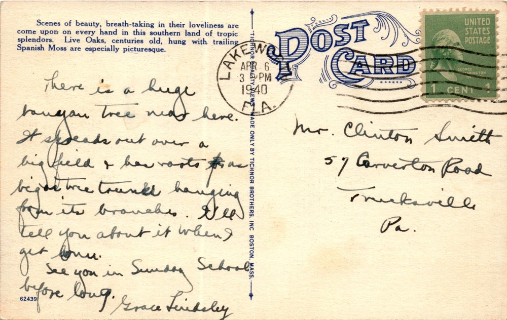 MAKE AN OFFER. THE MORE YOU BUY THE BETTER DEAL I WILL ACCEPT The postcard describes the beauty and splendor of the southern land, with scenes of live oaks covered in Spanish moss and a huge banyan tree. The postmark on the card is from Kemah, Texas, dated April 6, 1940. The recipient is Mr. Clinton Swett from Trucksville, Pennsylvania.