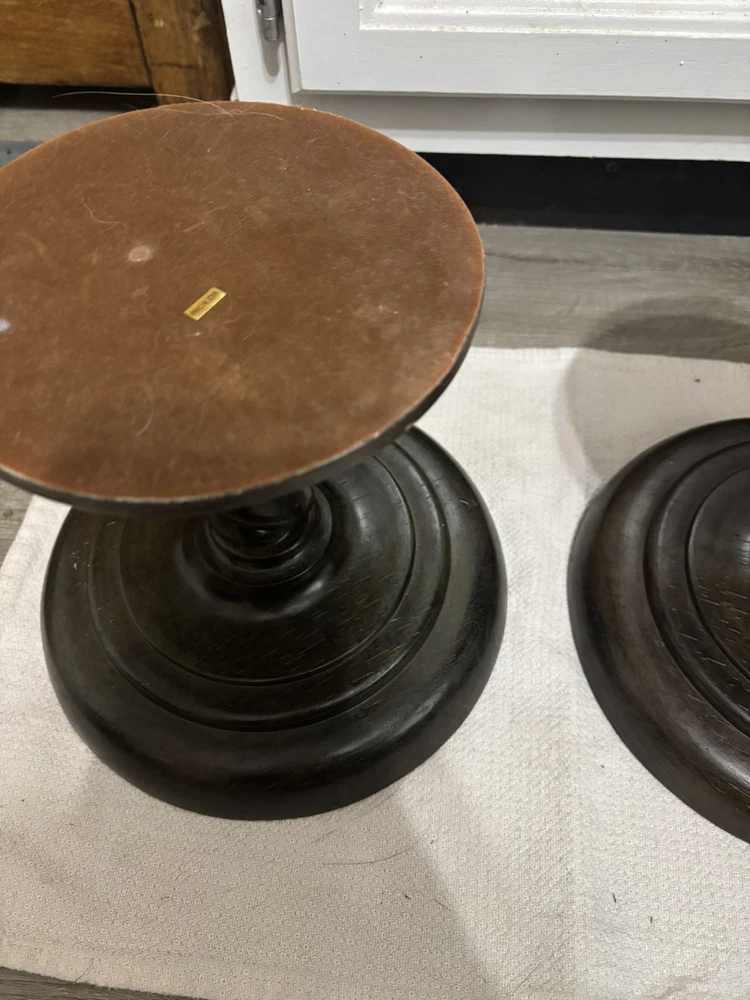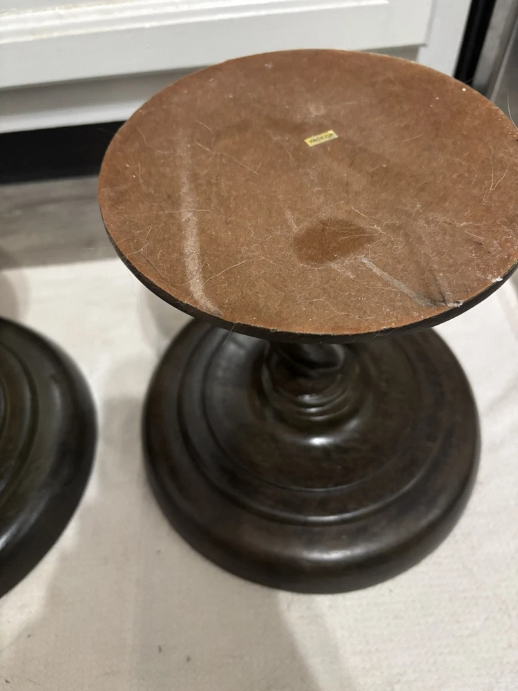 Southern Living At Home Pedestals (2). Wood. Heavy. Original Owner. I have used these as risers for Christmas displays, to hold pies, the list goes on. There are small areas to be touched up with wood paint marker otherwise in good condition. Please see pictures.