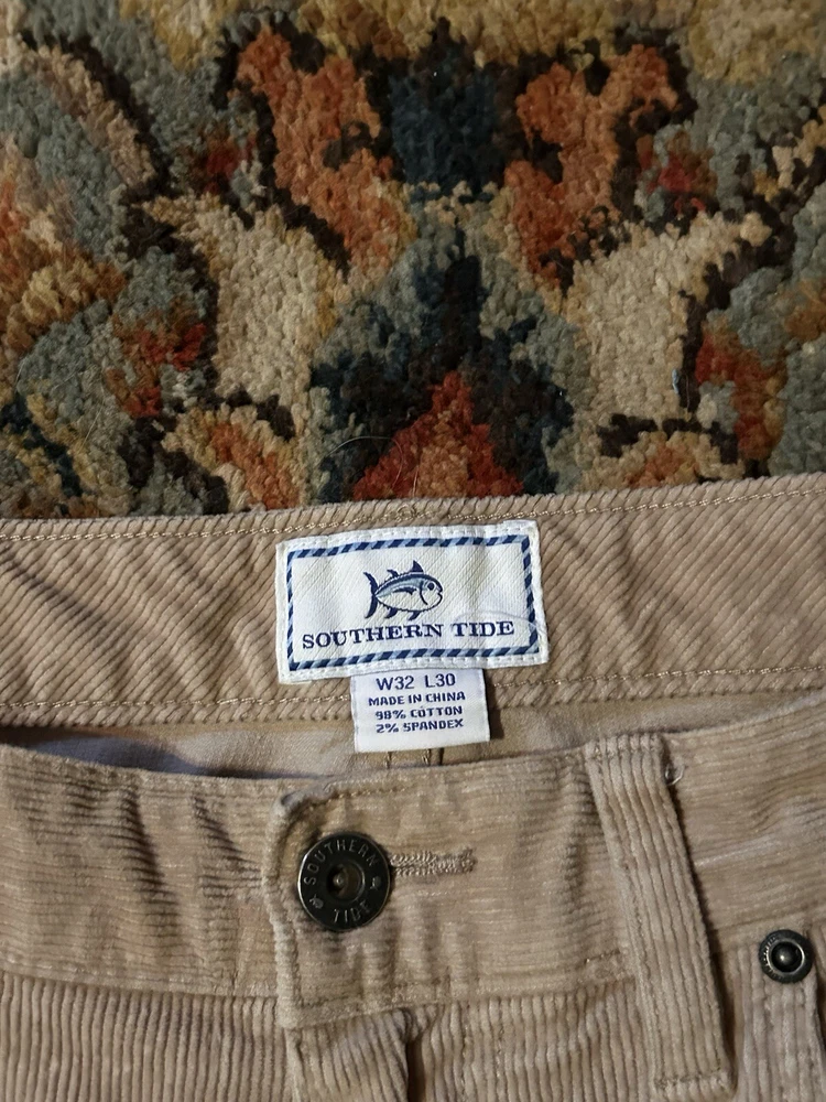 Southern Tide Mens Straight Leg Corduroy Pants Beige Measured 34x30 Waist: 34 in Inseam: 30 in Rise: 11.5 in Please be aware that used, vintage, or older items may show a few signs or wear or slight fading due to age. Anything visible, such as stains, rips or holes are a possibility, if not shown initially. Measurements are taken from the waist, the inseam of the pant leg and the rise from the top of the jean to the end of the crotch.