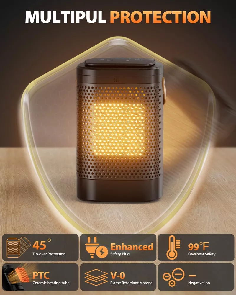 Faster Heating:The space heater for indoor use combines an advanced PTC system with a new heat funnel design to provide heat within seconds and enhance warm air circulation, heating up to 240% farther than traditional heaters Safe Design: This space heaters for indoor use come with an innovative tilt detection sensor that improves accuracy and reliability for better tip-over protection, and features V0-rated flame-retardant material, overheat protection, and a safety plug Compact and Powerful: This portable heater build in carry handle and powerful heat that fits everywhere. providing precise and comfortable warmth. The 80° wide-angle oscillation covers the entire area, offering widespread heat for your bedroom, garage, basement, office, desk, and more Multi-modes: This Smart electric heater equipped with multiple heating levels and modes to heat as you like. (Digital Display, 1-12H Timer, Negative ion mode and Fan Mode) Quiet and Efficient: The portable heater adopts silent fan design, and the working sound is less than 25 decibels, which will not affect your work and sleep. 12 hours timing design, you can turn the heater on and off when you need it