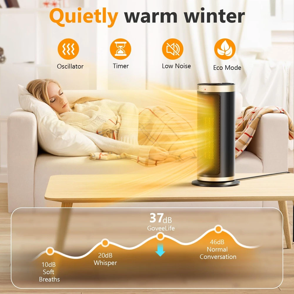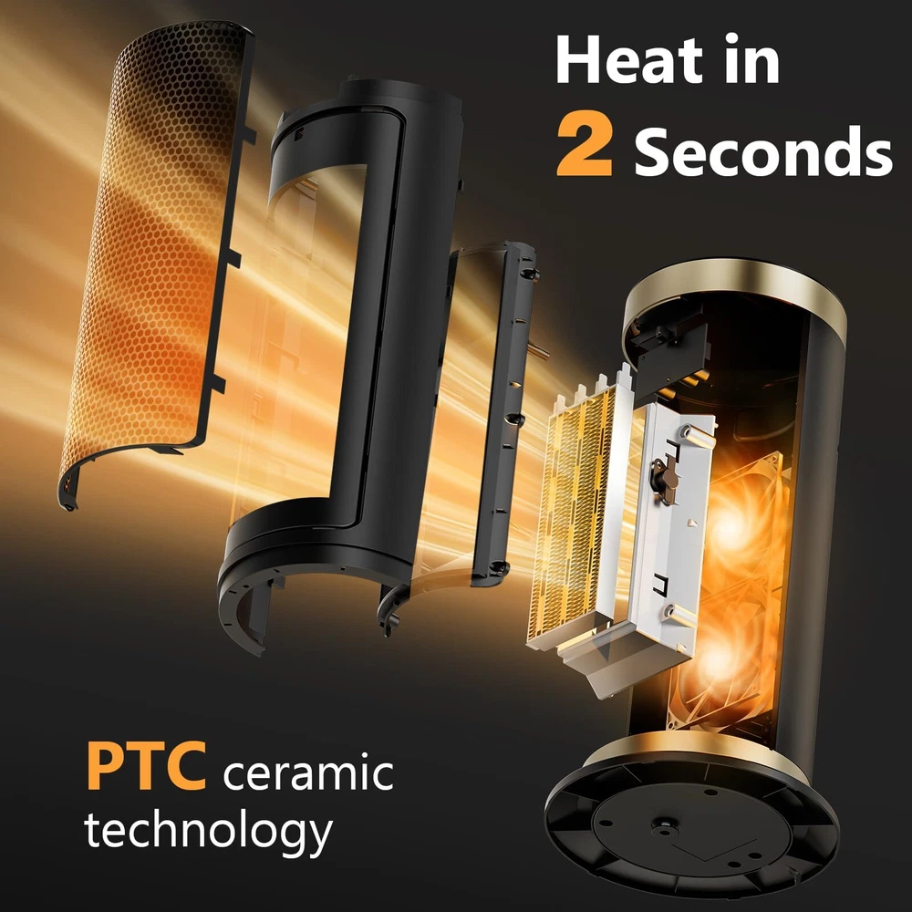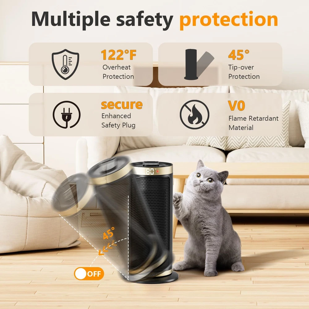 Fast and Uniform Indoor Heating: ceramic heater adopts advanced PTC ceramic heating technology and a high-efficiency fan to provide fast heating in 2S. The 70° wide-angle oscillation, boosts heating coverage by 20%, which helps distribute the warm air more evenly towards the room's corners, suitable for warming up spaces in the home including bedrooms, basements, garages, living rooms, and can also be used in offices, dorms, hot yoga studios, etc Multiple Safety Protections: This room heater has multiple safety features, including anti tipping protection, overheating protection, 24-hour no interaction, automatic shutdown, safety plug, and V-0 flame retardant, and it has passed ETL certification. It will shut off automatically when it is overheated or tipped over accidentally. It is made of high-quality V-0 flame-retardant ABS material, which is suitable for families with children and pets, allowing you to spend a safer and warmer winter. Smart Control and Low Noise: One touch to change the temperature and mode on the LED digital display, or use the remote control to adjust the heater's temperature, timer, and more from a distance. While the adjustable timer allows you to select 1 to 12 hours. This heater fan adopts a brushless DC motor that runs quietly and smoothly, as quiet as 35 dB, allowing you to sleep or work with peace of mind. Save More on Energy Bills: Equipped with 900W low-temperature mode and 1500 high-power heating mode, energy-saving heater with built-in intelligent temperature sensor, ECO Mode adjusts the heat level automatically to reach your desired temperature while saving more on energy bills. Personalize your own comfort with the digital thermostat from 41 to 95 ℉, adjustable in 1℉ increments. Precise Heat, Precise Comfort. The built-in handle on the back of this indoor space heater makes it easy to carry and store, allowing you to easily move it from the bedroom to the living room, kitchen, office, dormitory, garage, basement, and other places you want to use.