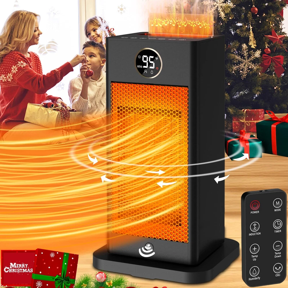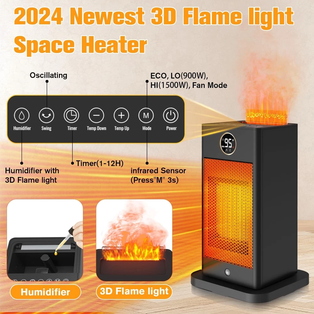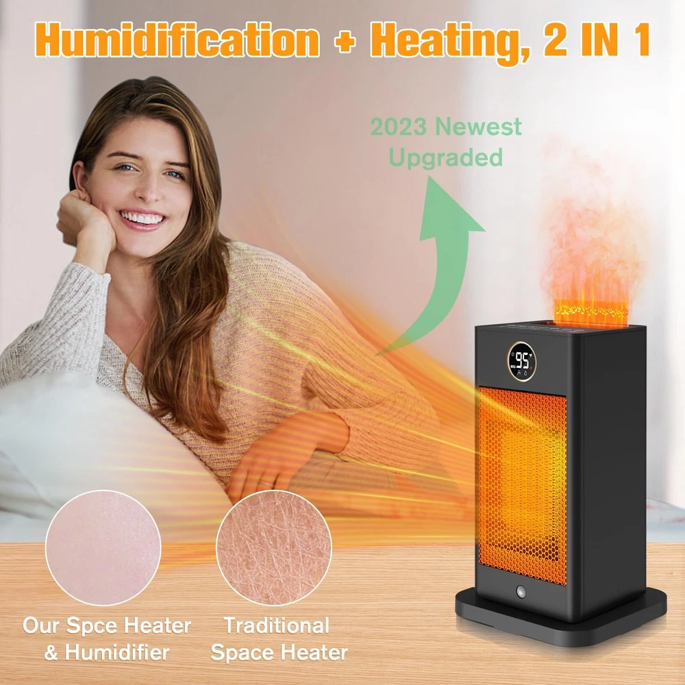 Fast Heating with Sensor: Our PTC space heater for large rooms heats up in just 2 seconds. The infrared sensor function activates when you hold down the "M" button for 3 seconds. It detects your presence and automatically turns on/off, saving energy and eliminating the need to manually switch it on and off as you come and go. Humidifier Function of Space Heaters:Say goodbye to dryness with our indoor space heater featuring an upgraded safe humidifying technology. Pour water into the separate water tank and press the humidifier button to enjoy up to 6-8 hours of mist. The separate tank ensures absolute safety by keeping the humidification system separate from the heating system. Fast and Safe Heating: The portable indoor space heater is made of upgraded high-quality materials and uses the latest heating technology. It heats up in seconds, 2-3 times faster than traditional heaters. With wider oscillating, it provides a greater heating range for your office, room, garage, bedroom, basement, desk, or yoga studio. ETL Certified Protection: Our large room indoor space heater is ETL certified with tip-over and overheat protection. In case of accidental knockdown, the built-in protection design will alarm and shut off automatically. It also features ECO (41℉-95℉)/LO (900W)/HI (1500W)/Fan, oscillating, and low noise at 32db. The ECO mode maintains the desired temperature and saves energy. Portable and Quiet: The indoor space heater is portable with a handle and easy to use. Its perfect size can be placed anywhere, and weighing only 2 pounds, it can be conveniently carried. The PTC electric ceramic heater uses the newest ultra-quiet technology with only 35db of sound, allowing you to enjoy peace and warmth.