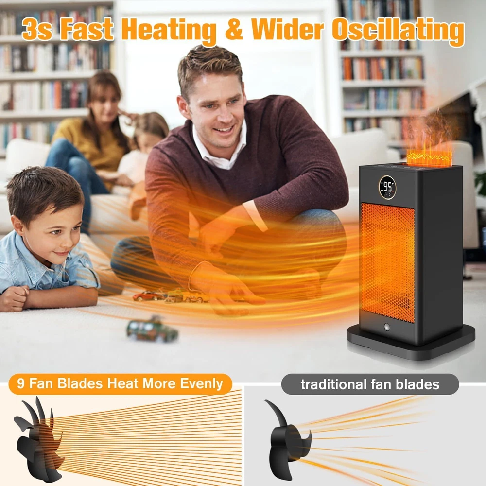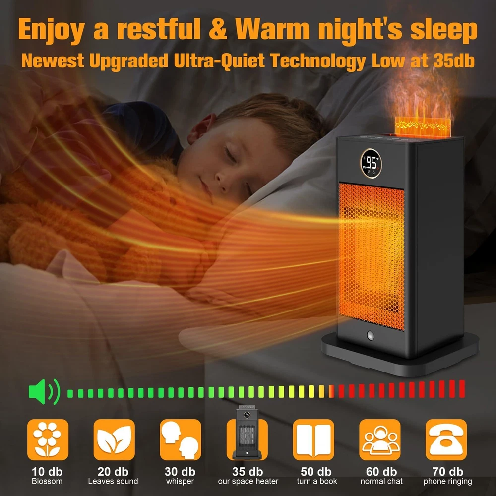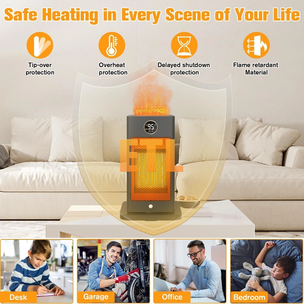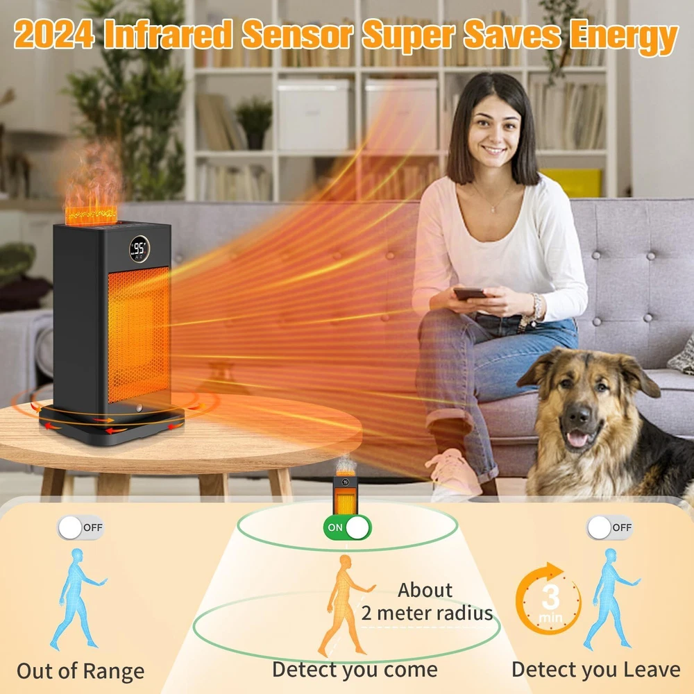 Fast Heating with Sensor: Our PTC space heater for large rooms heats up in just 2 seconds. The infrared sensor function activates when you hold down the "M" button for 3 seconds. It detects your presence and automatically turns on/off, saving energy and eliminating the need to manually switch it on and off as you come and go. Humidifier Function of Space Heaters:Say goodbye to dryness with our indoor space heater featuring an upgraded safe humidifying technology. Pour water into the separate water tank and press the humidifier button to enjoy up to 6-8 hours of mist. The separate tank ensures absolute safety by keeping the humidification system separate from the heating system. Fast and Safe Heating: The portable indoor space heater is made of upgraded high-quality materials and uses the latest heating technology. It heats up in seconds, 2-3 times faster than traditional heaters. With wider oscillating, it provides a greater heating range for your office, room, garage, bedroom, basement, desk, or yoga studio. ETL Certified Protection: Our large room indoor space heater is ETL certified with tip-over and overheat protection. In case of accidental knockdown, the built-in protection design will alarm and shut off automatically. It also features ECO (41℉-95℉)/LO (900W)/HI (1500W)/Fan, oscillating, and low noise at 32db. The ECO mode maintains the desired temperature and saves energy. Portable and Quiet: The indoor space heater is portable with a handle and easy to use. Its perfect size can be placed anywhere, and weighing only 2 pounds, it can be conveniently carried. The PTC electric ceramic heater uses the newest ultra-quiet technology with only 35db of sound, allowing you to enjoy peace and warmth.