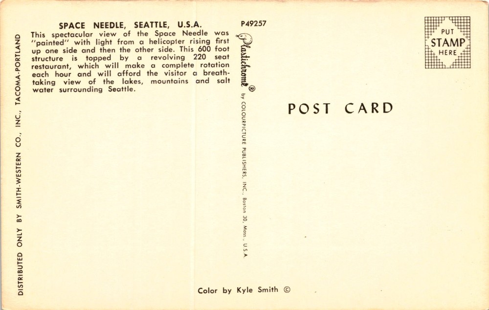 MAKE AN OFFER. THE MORE YOU BUY THE BETTER DEAL I WILL ACCEPT The postcard features a stunning view of the Space Needle in Seattle, USA. The Space Needle is a 600-foot-tall structure with a revolving 220-seat restaurant at the top, offering visitors a panoramic view of the lakes, mountains, and saltwater surrounding Seattle.