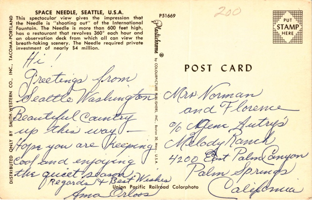 MAKE AN OFFER. THE MORE YOU BUY THE BETTER DEAL I WILL ACCEPT The postcard features an image of the Space Needle in Seattle, USA, which stands at over 600 feet tall and gives the impression of shooting out of the International Fountain. The Space Needle has a revolving restaurant that completes a 360° rotation each hour, as well as an observation deck offering breathtaking views of the surrounding scenery.