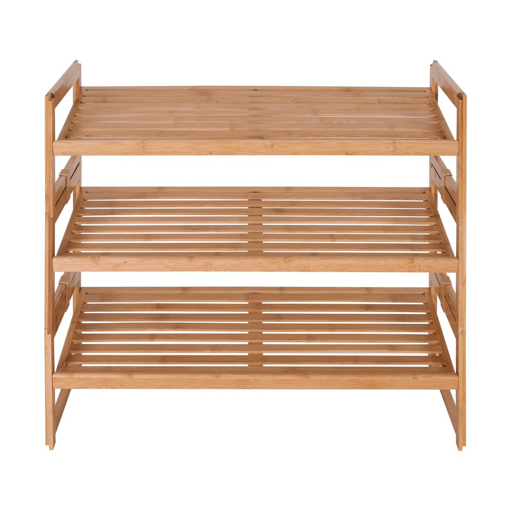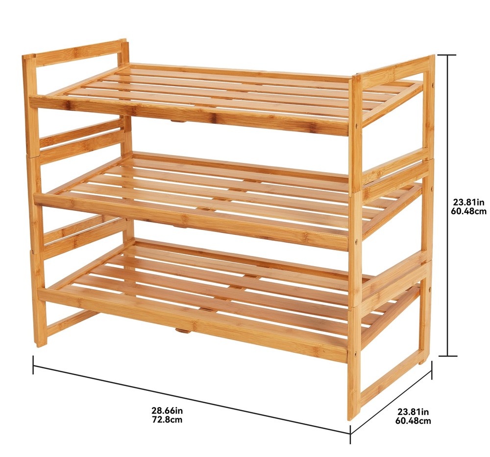 Bring the durability of bamboo to your home organization with the Better Homes & Gardens Bamboo 3 Shelf Shoe Rack. This stylish and eye-catching storage aide is a great addition for nearly any home. Two bottom shelves make storing and arranging your favorite six pairs of short shoes and sandals easy, while three pairs of larger shoes and boots can be displayed easily for quick retrieval on the top shelf. The Better Homes & Gardens Bamboo 3 Shelf Shoe Rack has a rustic wood look that blends beautifully into any home decor. On Jul 1, 2025 at 02:46:42 PDT, seller added the following information: