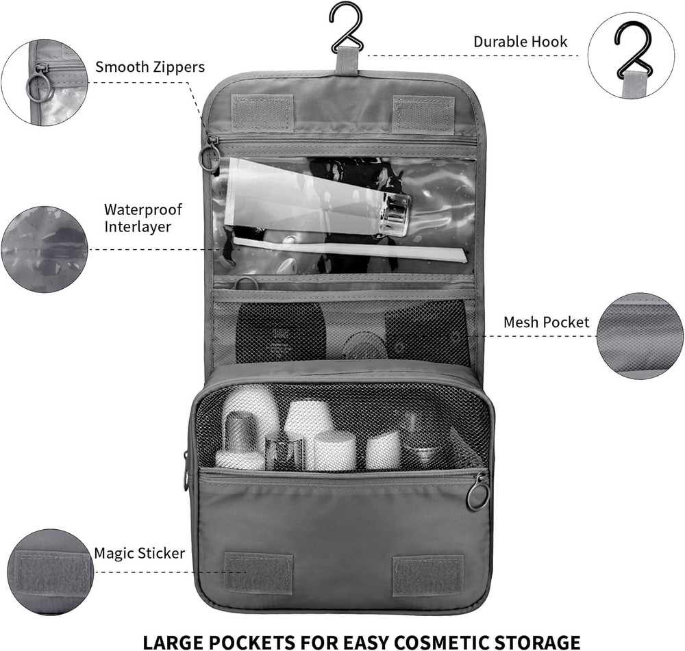 Large Capacity Toiletry Bag Travel with Hanging Hook for Men and B-Black Product Details Product Dimensions: 7.3 x 3.93 x 16.7 inches Item Weight: 4.2 ounces Manufacturer: Lcsmaokin Country of Origin: China Large Capacity:Lcsmaokin folded size of the toiletry bag is 9.45 x 7.28 x 0.39 inches,the unfolded size is 9.45 x 4 x 16.9 inches,and it weighs 0.33 lbs,which is suitable for your family trips to pack all kids,men and women toiletries Quality Fabric:The cosmetic bag is made of high quality oxford cloth,the surface is waterproof,wear-resistant,durable and practical.The shower bag can be hung on towel racks,coat racks and anywhere else available to save much space Multiple Storage:It's easy to separate wet and dry items because of internal design waterproof compartment.Body washes,shampoos and other bulky items can be put right into the bag.Don't worry your items will spill,because there are dividers inside Practical Occasions:This toiletry bag is convenient to carry toiletries,cosmetics,daily supplies etc.It is suitable for business trips,home travels,gym showers,swimming,outdoor activities and so on Easy to Use:A large toiletry bag can help you categorize toiletries and cosmetics and separate them from other items.This travel toiletries bag is suitable for both men and women,and comes in multiple colors to choose from