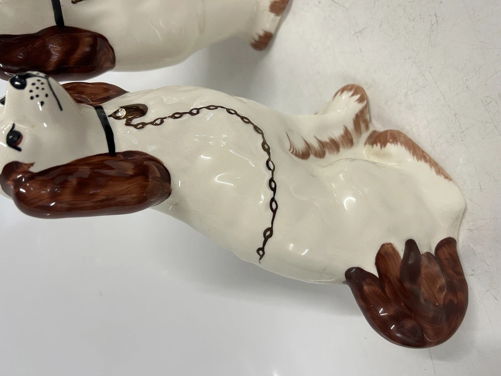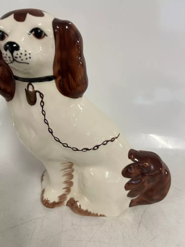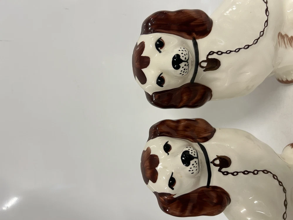 Description: This item is a pair of ceramic Staffordshire Style dog figurines, featuring brown and white coloring typical of spaniels. They are intricately designed with chain detail on their collars, making them ideal for collectors and home decor enthusiasts. Condition: Used - Very good. Minimal signs of wear. Please see photos. Materials: Ceramic Sizing & measurements: Height 21cm Purchasing If you have any difficulties with your purchase, please contact us through our eBay site and we will resolve any issues promptly. Delivery, payment and collection All purchases must be paid for within 4 days of the item ending. If purchases are to be collected this must be within 10 days of purchasing items - unless stated otherwise. Collection address: Saint Francis Hospice - Ashton Gate Unit 10 Ashton Road – Harold Hill RM38UF Collection can be made from Monday – Friday 10.00 am-4.00 pm (Bank Holidays excluded) Unpaid for Items If items are not paid for within 4 days of winning the bid - then the item will be cancelled and relisted on Ebay. Items not collected within 10 days will be refunded and relisted unless agreed otherwise with the Saint Francis Hospice Online Team. We aim to dispatch all buyer purchases within 5 working days, once payment has been received. Thank you for supporting us! – 100% of all proceeds go to Saint Francis Hospice to support local people when they need us most.