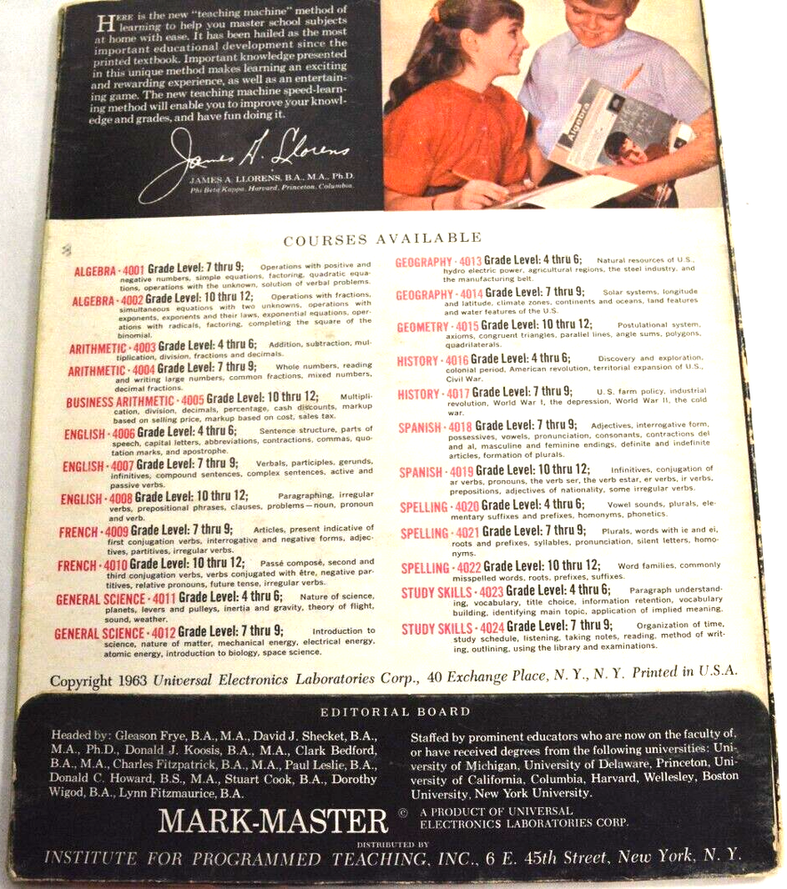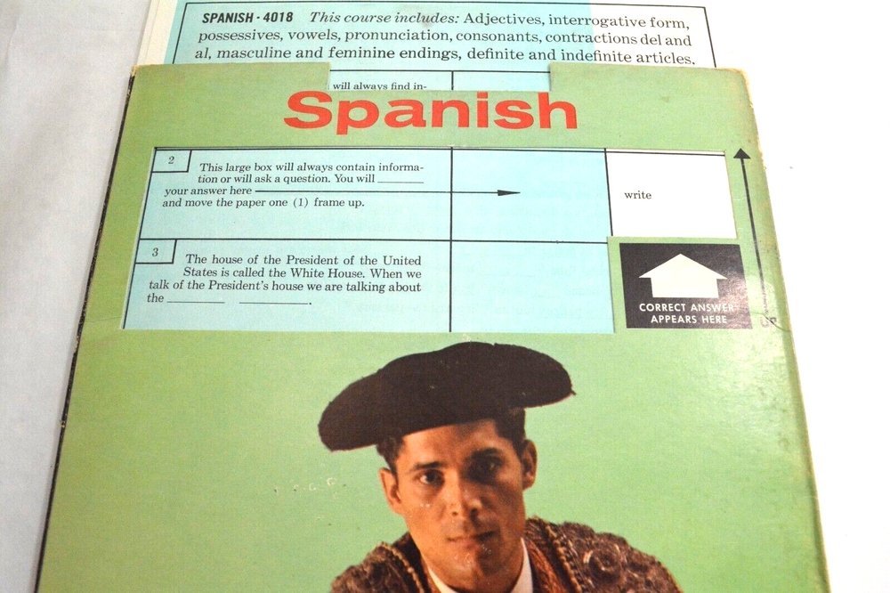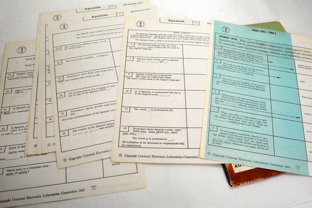 Spanish 4018 by Universal Electronic Laboratories Mark Master Automated Speed-Learning System 1963 Grade 7-9 has 32 pages with 102 questions and answers Measuring 8.5" x 11" condition is Very Good Remember We Want you happy We ha ve a no-hassle return policy Email me with Questions Be sure to add me to your favorites list! Check out my other items! PAYMENT & SHIPPING: Payment is due within 7 days of auction completion. We strive to ship the same day and 90% of our sales ship the same day payment is received. However, we do not work on the holidays or weekends so on occasion we will ship within a few days at the most. Please don`t forget to leave positive feedback and a five-star rating. Our system leaves feedback automatically when we receive feedback. We strive to make every transaction a 5-star rating for both of us! Shipping is done via USPS. All items have tracking numbers which are emailed to the customer. Any item valued $250 and up will have a USPS signature confirmation at no exta charge. If you would like to add insurance, please request as it is no longer an option through eBay check out I am happy to discount shipping on multiple purchases made in the same auction week. Please wait for me to invoice you with the discount after the auction ends. If you make a payment, we will refund the difference. Shipping to AK, H, PR, APO/FPO takes a little longer to arrive. Please do not give negative feedback or claim item has not arrived due to the post office delay Questions are usually answered within 24 hours, so please contact us with any questions or problems. We strive to resolve all questions/issues. INTERNATIONAL BUYERS: Shipping Cost tends to be a little higher than US shipping costs for items. Any item $76 dollars and up is shipped registered, insured and usually runs about 17-20 dollars depending on price and weight of an item. Import duties, taxes, and charges (typically collected upon delivery or pickup) are the buyer's responsibility and are not included in the item price or shipping charges. Please check with your country's customs office prior to bidding/buying to determine what these additional costs will be. We claim the value of the package by the ending item price. I cannot claim your item as a gift to avoid customs fees, as it is against the law. International usually takes up to 3 to 6 weeks to arrive so please don't file negative feedback because of the Post Office or Customs delay! RETURN POLICY: Returns are accepted up to 14 days after the auction end. Please ask all questions prior to bidding. Almost all of my pieces are handmade, so they will not be perfect. Vintage and used pieces will have some wear to them. I will point out any damage that I see. We strive to describe everything correctly but occasionally we might miss a measurement or blemish so please look at all the pictures carefully. LEGAL TERMS OF SALE: We try our very best to represent my items as accurately as possible. Items are guaranteed as described. Please read the whole description and look at pictures carefully as they are considered part of the description. Interpretation of condition and measurements are the buyer’s responsibility. Colors may not always be exact, Cameras will sometimes slightly alter the color of items and it may not match the picture exactly-that is not misrepresentation. Antiques and Collectibles are guaranteed to be authentic. If an item is improperly described it would not be intentional. We are aware that mistakes do happen and want you to be happy as your satisfaction and shopping experience is important to us. We will refund any misrepresented item. By confirming the bid, you are confirming you have read all of the terms listed above and understand them. Thank you.