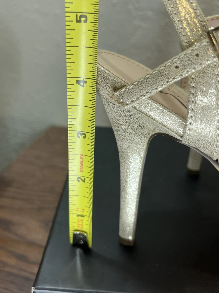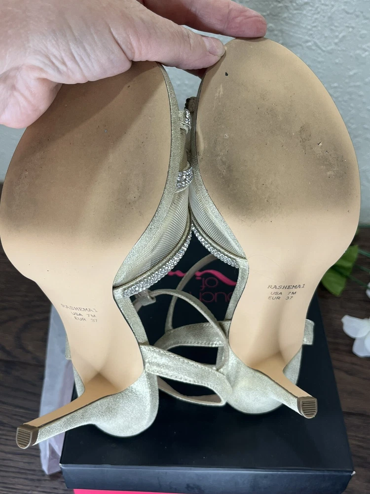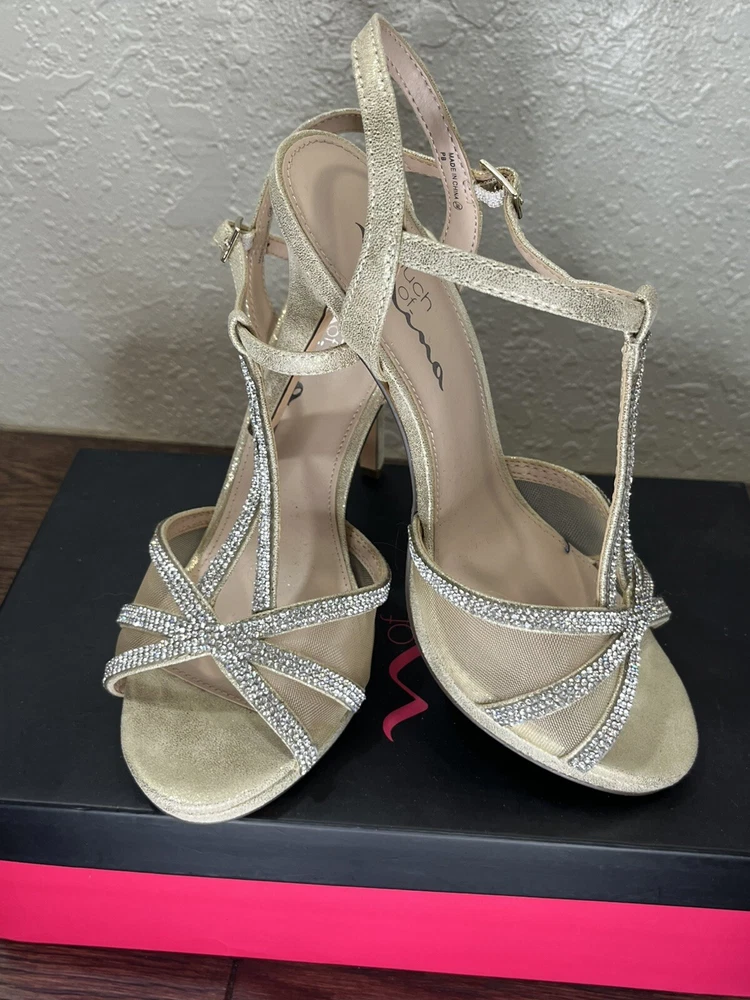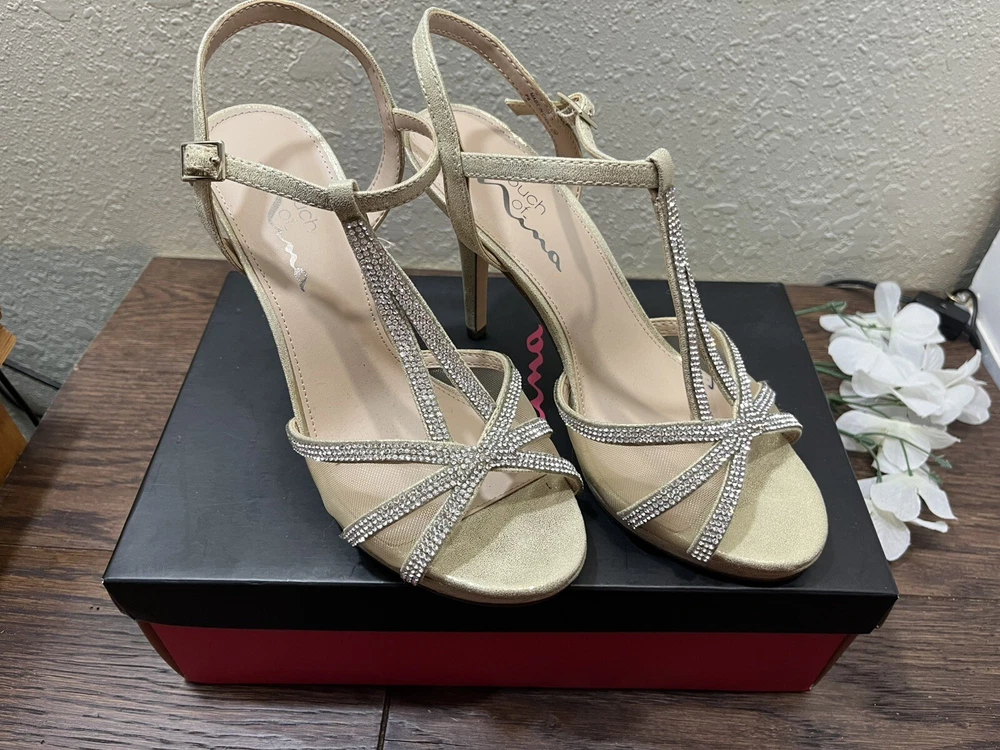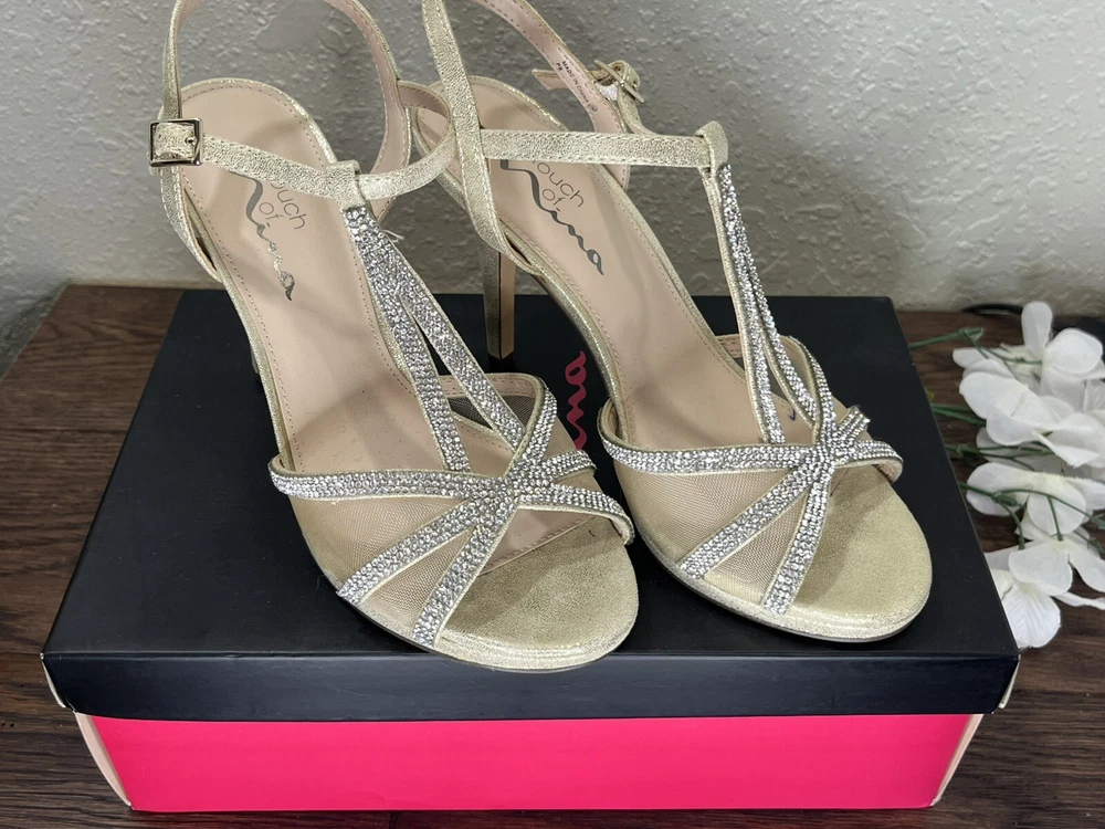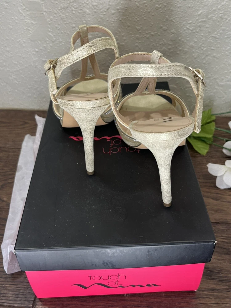 Step out in style with these Silver rhinestones on a beige base, 'Touch of Nina' Heels. The strappy sandals feature a sparkly silver rhinestone pattern with glitter and beaded accents. The open toe stiletto heels are perfect for formal occasions and add a touch of glamour to any dress. The shoes are available in women's size 7M and are suitable for various events. The synthetic upper material ensures durability, while the stiletto heel style provides a chic and elegant look. Absolutely gorgeous pair of shoes. Perfect for prom, homecoming, any formal event. These shoes are an excellent condition and barely show where if it were not for a little soil on the bottom of the SOLE. These issues come in their original box.