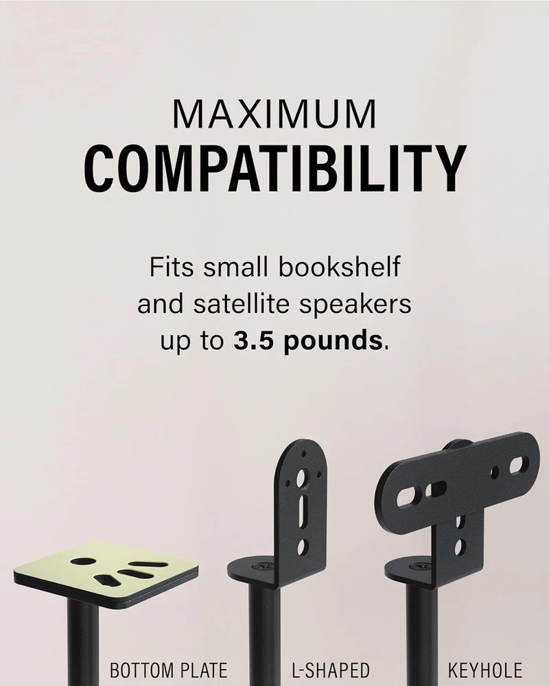 Height Adjustable: Customize your sound thanks to 10 inches of height adjustment. Now you can mount your speakers directly at ear level, just twist the collar and adjust from 28 to 38 inches. No tools required! Premium Design: Built from heavy-gauge steel, these speaker stands will help deliver top quality sound while keeping your speakers safe. The wide base helps prevent against bumps or falls, and included felt pads minimize vibration. Universal Speaker Stand: Engineered to securely hold small satellite and bookshelf speakers up to 3.5 lbs, these stands offer three versatile mounting options: L-shaped brackets, a top plate, and a keyhole adapter, ensuring maximum compatibility with your speakers. DIY Installation: Easy as 1, 2, 3. This speaker stands pair come with everything you need to take your speakers to new heights, including hardware, base pads and different mounting brackets for your unique setup. SANUS Difference: The SANUS adjustable height speaker stand comes with a 5-year warranty, and top-notch Minnesota based customer service. Our experts are ready to chat 7 days a week if you have questions or run into a snag.