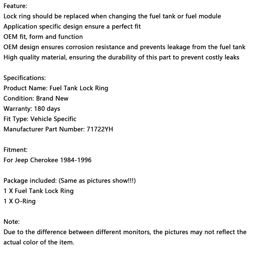 Product Description Feature: Lock ring should be replaced when changing the fuel tank or fuel module Application specific design ensure a perfect fit OEM fit, form and function OEM design ensures corrosion resistance and prevents leakage from the fuel tank High quality material, ensuring the durability of this part to prevent costly leaks Specifications: Product Name: Fuel Tank Lock Ring Condition: Brand New Warranty: 180 days Fit Type: Vehicle Specific Manufacturer Part Number: 71722YH Fitment: For Jeep Cherokee 1984-1996 Package included: (Same as pictures show!!!) 1 X Fuel Tank Lock Ring 1 X O-Ring Note: Due to the difference between different monitors, the pictures may not reflect the actual color of the item. ♦ If you are not sure about the part fitment to your vehicle, please supply your Vehicle Model / VIN number / OE Part Number we will check it for you! ♦ Compatibility Chart is for the reference only. The best way to check compatibility is to check the Part Number on your old unit if possible. SHIPPING & HANDLING RETURNS WARRANTY ABOUT US ♦Every item will be inspected and packed carefully before shipping. ♦ Processing Time : shipped within 1 business days (Mon-Fri, excludes holidays) ♦ Estimated delivery time : 3-5 business days . ♦ Tracking Info : Provided automatically via eBay. ♦All orders will be shipped through USPS First Class, UPS and Fedex depends on the weight of the items. ♦ Fast & Reliable Shipping – Your order is our priority! Same-Day Shipping: Order by 2 PM EST, ships today! 🌍 Ships from U.S. Warehouse – No long waits! 📦 Standard Shipping (Free): 3-5 business days (U.S. only). We Want You to Love Your Purchase! Our 60-day return policy protects you: ✨ STEP 1 : Message Us First - we often solve issues without returns! ✨ STEP 2 : If the return is due to change of mind, select "Didn't like item" or "Ordered by mistake" . For tem not as described, provide details and photos to help us assist you promptly. Why Contacting Us First Helps You: • Faster solutions (often within 48 hours !) • Possible instant refund or replacement options • Personalized return instructions for your case For Your Protection: • We carefully inspect all returns • Please use tracking when shipping back • "Not as described" returns require photos/video for fastest resolution Help us serve you better by contacting us first! No-Questions-Asked Warranty ♦HASSLE-FREE WARRANTY • 90-365 Day Coverage (varies by product - see listing details) • No Return Required for claims under $20 - we ship replacements immediately ✖ Exclusions : Physical damage (drops/accidents) Installation errors (YouTube tutorial links provided) ♦ Claim Process: Contact us via eBay Messages within warranty period Clear photos/video of the issue We respond within 24-48 hours with solution About Artudatech Established in 2009, Artudatech is specialized in auto parts and are manufacturers of leading auto parts brands,It is headquartered in California with convenient transportation. Artudatech including majority of the best seller autoparts which are fully compatible with the vehicles. When you need parts for your car, reach out to us so that your car could go more far than ever. All of the parts have warranty. Please contact with our customer service crew if you encounter any questions or concerns, we stand behind every part in our store. Excellent product and considerate service. Let time verify quality and win the future with reputation. We hope you can find what you want here and enjoy your shopping. SHIPPING & HANDLING ♦Every item will be inspected and packed carefully before shipping. ♦ Processing Time : shipped within 1 business days (Mon-Fri, excludes holidays) ♦ Estimated delivery time : 3-5 business days . ♦ Tracking Info : Provided automatically via eBay. ♦All orders will be shipped through USPS First Class, UPS and Fedex depends on the weight of the items. ♦ Fast & Reliable Shipping – Your order is our priority! Same-Day Shipping: Order by 2 PM EST, ships today! 🌍 Ships from U.S. Warehouse – No long waits! 📦 Standard Shipping (Free): 3-5 business days (U.S. only). RETURNS We Want You to Love Your Purchase! Our 60-day return policy protects you: ✨ STEP 1 : Message Us First - we often solve issues without returns! ✨ STEP 2 : If the return is due to change of mind, select "Didn't like item" or "Ordered by mistake" . For tem not as described, provide details and photos to help us assist you promptly. Why Contacting Us First Helps You: • Faster solutions (often within 48 hours !) • Possible instant refund or replacement options • Personalized return instructions for your case For Your Protection: • We carefully inspect all returns • Please use tracking when shipping back • "Not as described" returns require photos/video for fastest resolution Help us serve you better by contacting us first! WARRANTY No-Questions-Asked Warranty ♦HASSLE-FREE WARRANTY • 90-365 Day Coverage (varies by product - see listing details) • No Return Required for claims under $20 - we ship replacements immediately ✖ Exclusions : Physical damage (drops/accidents) Installation errors (YouTube tutorial links provided) ♦ Claim Process: Contact us via eBay Messages within warranty period Clear photos/video of the issue We respond within 24-48 hours with solution ABOUT US About Artudatech Established in 2009, Artudatech is specialized in auto parts and are manufacturers of leading auto parts brands,It is headquartered in California with convenient transportation. Artudatech including majority of the best seller autoparts which are fully compatible with the vehicles. When you need parts for your car, reach out to us so that your car could go more far than ever. All of the parts have warranty. Please contact with our customer service crew if you encounter any questions or concerns, we stand behind every part in our store. Excellent product and considerate service. L