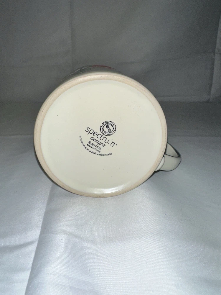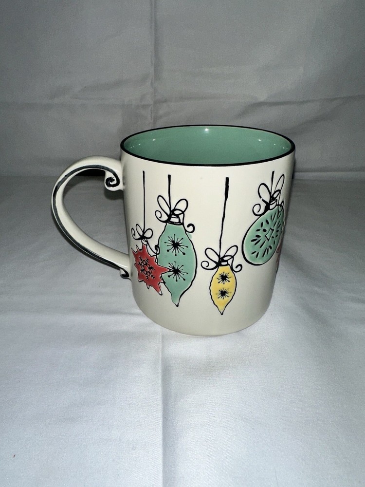 The Spectrum Designz 'Happy' Mug is a large ceramic coffee cup featuring round Christmas ball ornaments with an embossed and painted design. Manufactured in 2017, this 20oz mug is decorated in a multicolor all-over pattern, making it a festive addition to your holiday collection. Dishwasher and microwave safe, this contemporary mug is a cheerful choice for enjoying hot or cold beverages during the Christmas season.