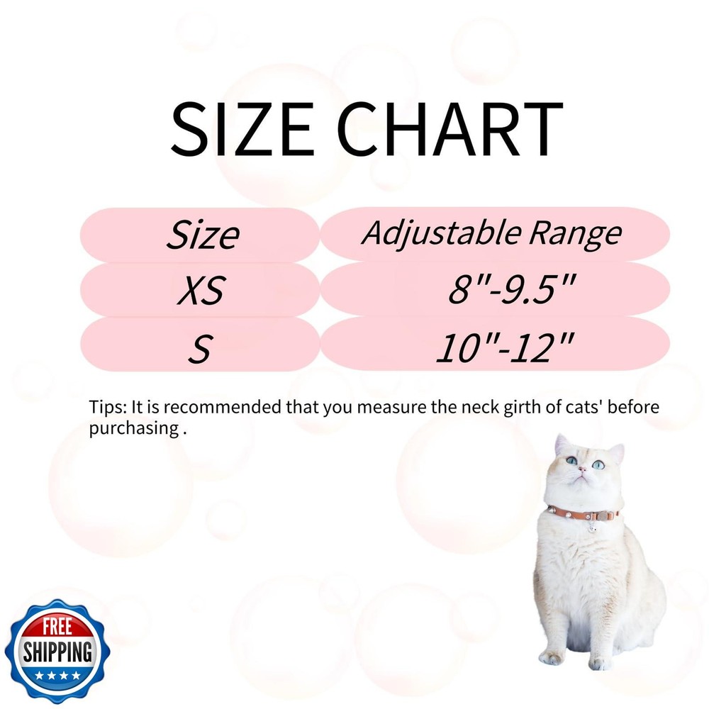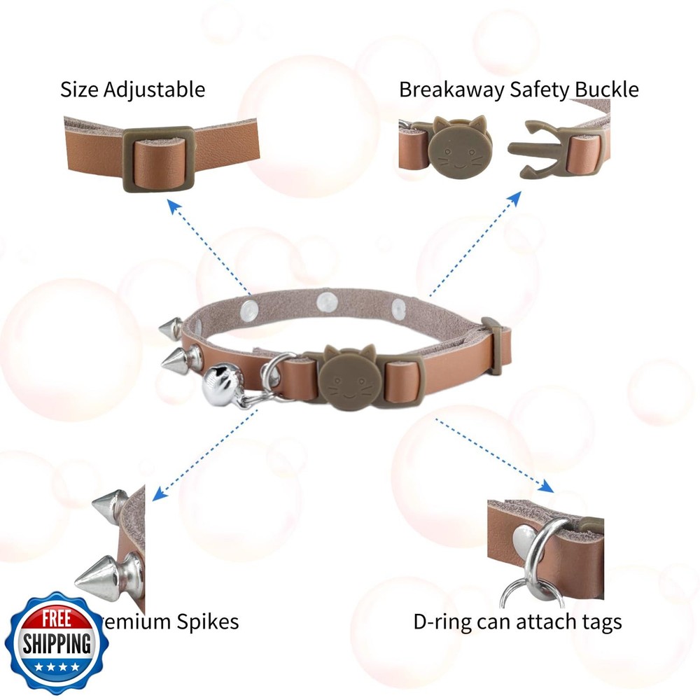 Spiked Cat Collar with Bells, Breakaway Genuine Leather Protective Collar for Kitty, Studs Spikes Punk Style Adjustable for Girl Boy Kittens Small Bunny Rabbit, 10"-12" Brown Features SIZE ADJUSTABLE - First of all, it is recommended that you measure the neck girth of cats' before purchasing. Size XS is best for cats whose neck girth is among 8 inches to 9.5 inches, and size S is for cats whose neck girth among 10 inches to 12 inches BREAKAWAY SAFETY BUCKLE - Breakaway collars are designed to open under force, very safe for cats, and convenient for you to open it. If your cat gets caught up on a fence post with a breakaway collar, the collar will un-latch and your cat will be set free PREMIUM MATERIAL - Made of genuine leather of high quality, soft, neat, and reliable PROTECTIVE COLLAR - The studs on the collar, to a certain extent, may help to protect your pets againest other annimals' attacks, when they are exploring nature alone MULTI- OCCASION USE - Suitable for daily life using both indoors and outdoors, this collar will always make your kitty both fashionable and adorable Shipping Free & Fast Shipping: We offer free shipping to most of the USA with a normal delivery time of 3-7 days. However, due to the current situation, additional delivery time (up to 3 weeks) may be required for some items. Alternative Carriers: We may use alternative carriers (e.g., USPS, FedEx, UPS) to ensure your package arrives safely and on time. Due to the use of multiple carriers, we are unable to provide a tracking number automatically. Handling Time: Orders are processed and shipped within 1-2 business days of receiving cleared payment. Shipping Restrictions: Shipping to Alaska, Hawaii, Puerto Rico, Guam, and other US territories may incur shipping charges or delivery restrictions. Please contact us before ordering, or your order can be refunded/cancelled. State Restrictions: Certain items may not be shipped to California due to state regulations. Contact for Tracking Updates: If you require tracking updates or have any concerns about the delivery of your order, please feel free to contact us, and we will be happy to assist you. Return Policy 30-Day Hassle-Free Returns: If you are not completely satisfied with your purchase, you can return the item for free within 30 days of receiving it for a full refund or exchange. Easy Return Process: Contact us, and we will provide you with a prepaid return shipping label and detailed instructions. No Restocking Fee: There are no restocking fees for returns. However, the buyer is responsible for return shipping costs if the return is not due to a seller"s error. Refund Processing: Refunds will be processed within 1 business day of receiving the returned item in its original condition. Feedback Your feedback is extremely important to us. We strive to provide the best products and customer service possible. If you are satisfied with your purchase, please take a moment to leave us a positive review. If you have any concerns or issues with your order, please contact us before leaving negative feedback. We are committed to resolving any problems and ensuring your satisfaction. Contact Us If you have any questions or concerns, please feel free to reach out to our customer support team. You can contact us through the eBay messaging system. We are available Monday to Friday, 9:00 am to 5:00 pm EST, and we will do our best to respond to your inquiry within 24 hours. Thank you for supporting our small family business!