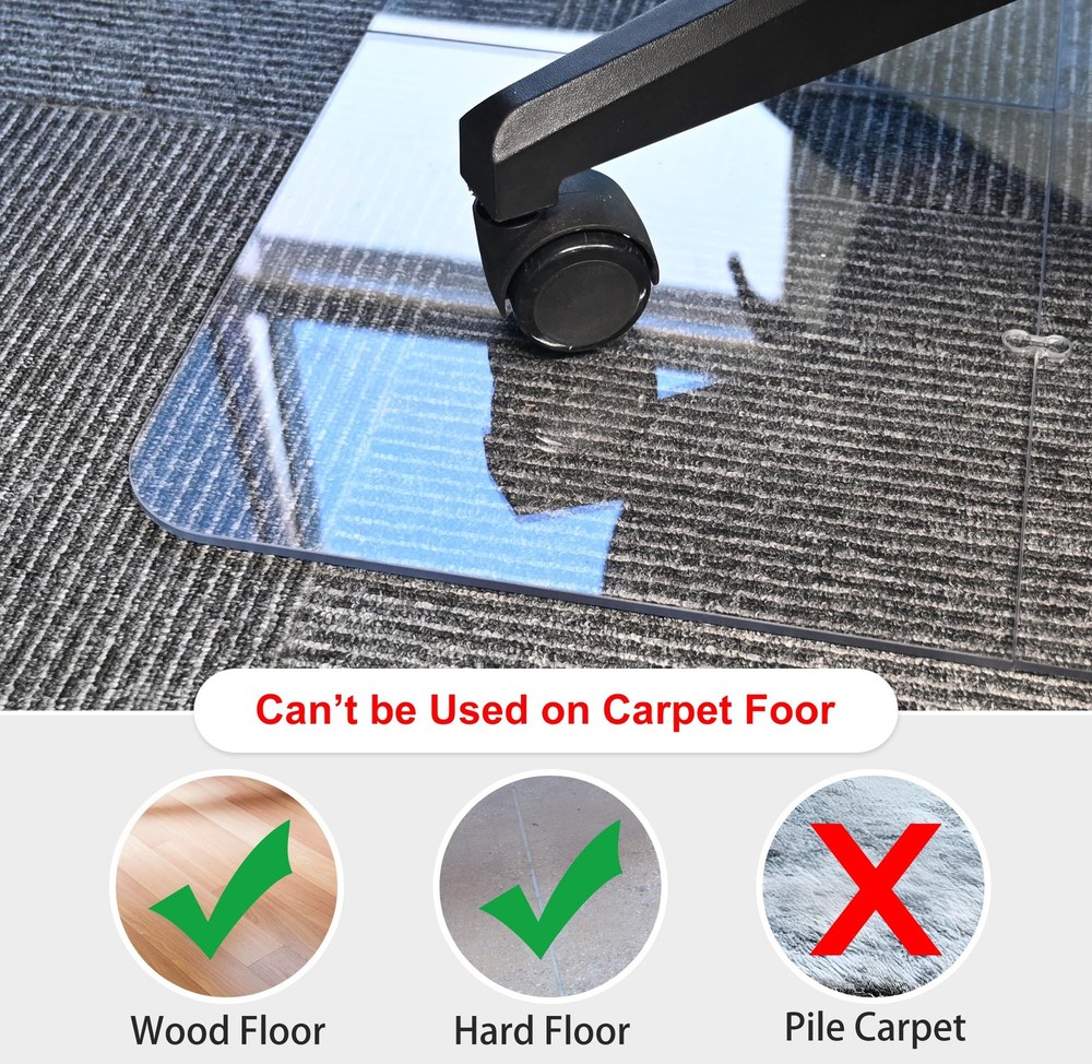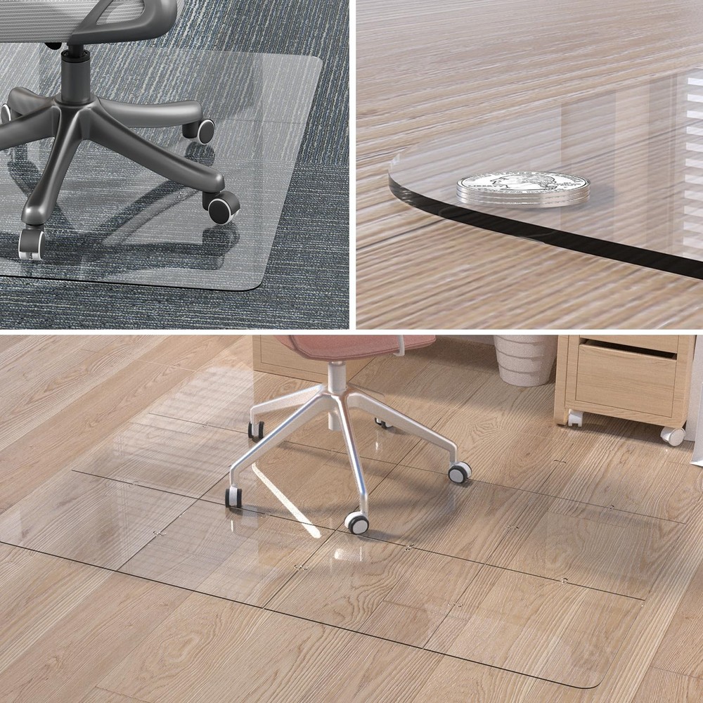Office Chair Floor Mat, 35.5x 47 Inch, 1/5 Inch Thick Floor Mat for Short Hair Carpet and Hardwood Floors Durable & Safe:Our clear office chair floor mat is crafted from high-quality polycarbonate (PC). It features exceptional hardness and toughness, making it unbreakable and resistant to wear. Plus, its flame-retardant properties ensure added safety for your workspace. Easy to Assemble:This modular floor mat is designed for effortless assembly. The interlocking pieces fit snugly together, maintaining stability while allowing for easy reconfiguration. Create a custom size that perfectly suits your office and can grow with your needs. Designed for Hard Floors:This floor mat is specifically engineered for hard surfaces. It is not suitable for long-pile carpets, ensuring optimal performance on smooth floors. Superior Floor Protection:Keep your floors looking new! Our floor mat effectively protects against scratches and damage caused by office chairs and rolling furniture, helping you maintain your space's pristine condition. Health & Safety Assurance:Our floor mat is non-toxic and odorless, creating a healthier environment for you. Choose safety and quality for your workspace.