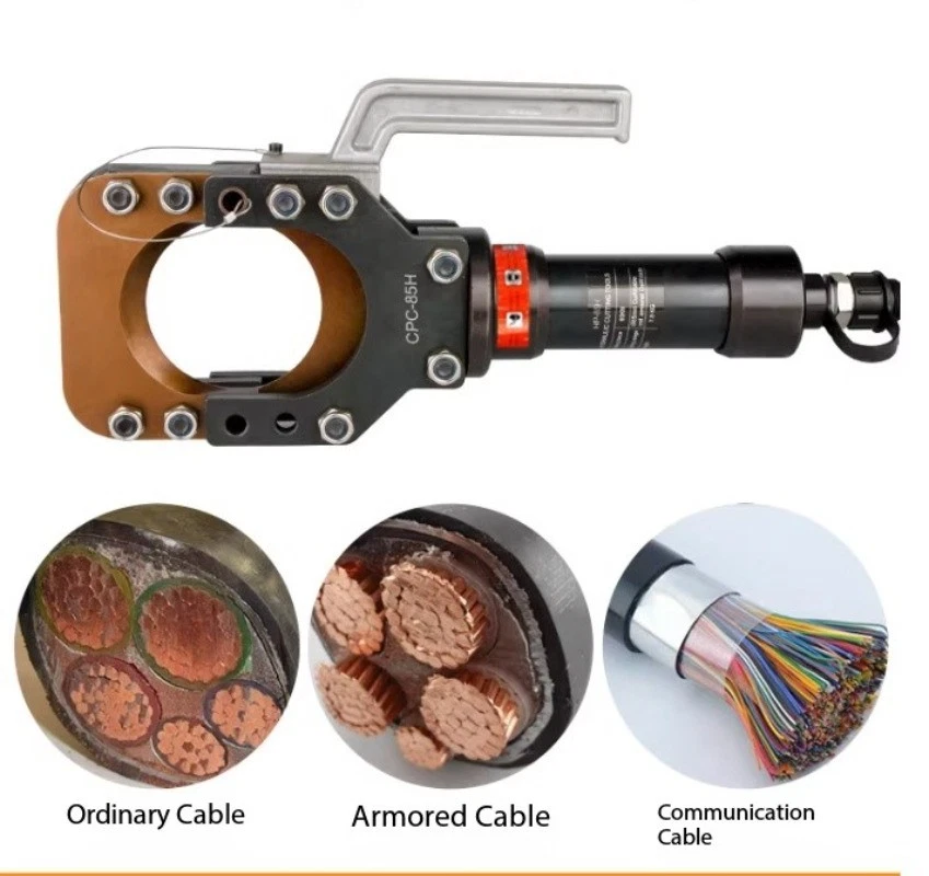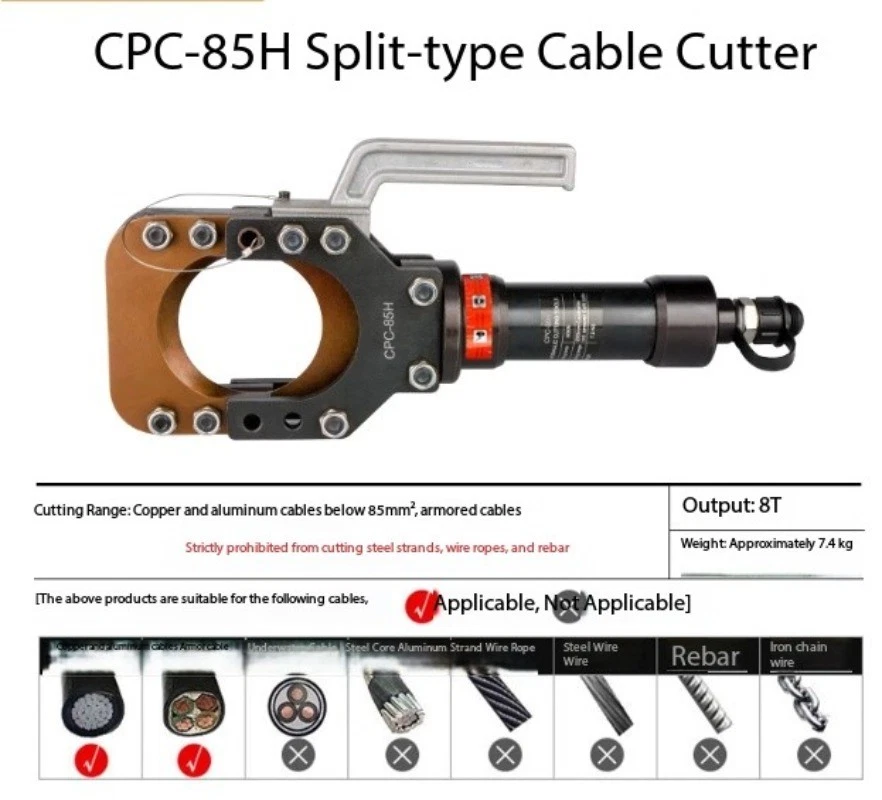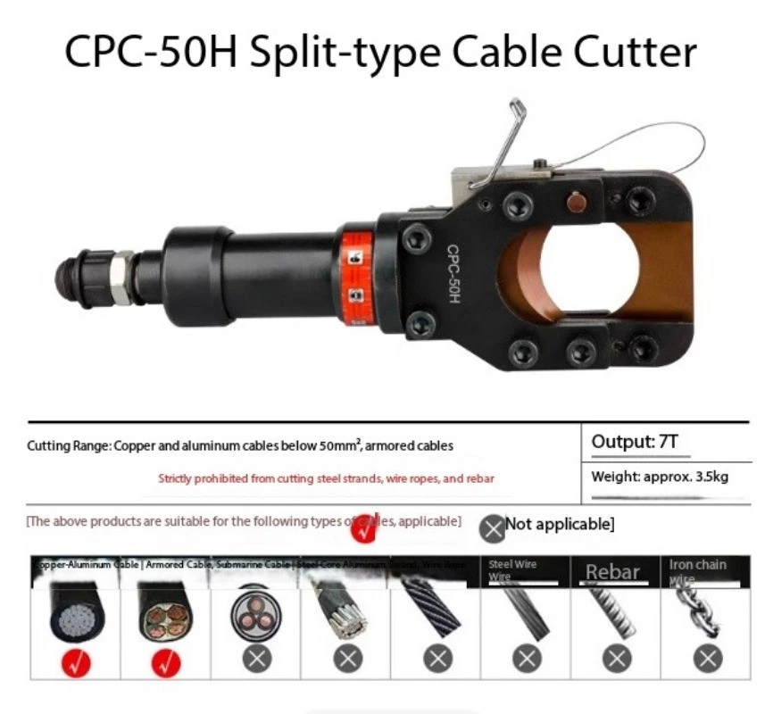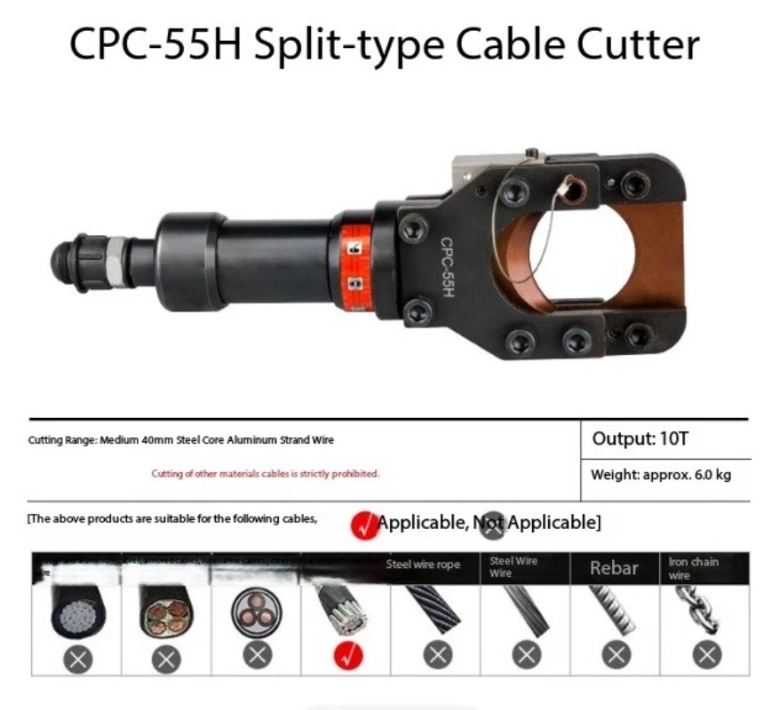 Split-Type Hydraulic Cable Cutter Hydraulic Cable Shears Electric-Hydraulic Cable Cutter Detachable Hydraulic Shears CPC-30H Split-Type Cable Cutter CPC-30H Cutting Range: Copper/aluminum cables under φ30mm, armored cables Strictly prohibited from cutting steel strands, steel ropes, or threaded steel bars Cutting Force: 6 kN Weight: Approx. 3.5 kg CPC-20H Split-Type Cable Cutter Cutting Range: Steel-core aluminum stranded wire ≤φ18mm, copper/aluminum cable ≤φ20mm, steel wire rope, rebar ≤φ12mm Cutting Force: 40 kN Weight: Approx. 2.0 kg
