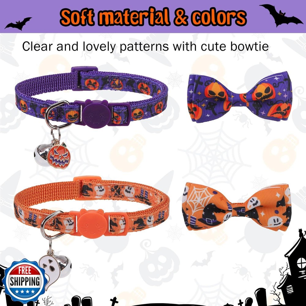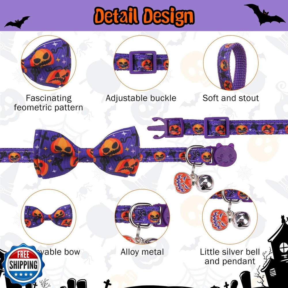 SCENEREAL Cat Collar Breakaway Halloween Theme 3 Pack, Safety Collars, Pet Accessory for Outdoor and House Cats Kittens, Orange Purple Features ADJUSTABLE: Our cute cat collar with a bow tie is adjustable from 7.8"- to 11.5" in length and 0.4" in width, suitable for most cats. Please test the tightness of the buckle for your cat before putting on a collar. FUN & FASHIONABLE: With its fun pattern design and bright colors, this collar is not only practical but also adds a touch of fun and fashion to your furry friend. Bow design makes your adult cats and kittens cute. BREAKAWAY CAT COLLAR: Our Halloween cat collar with a safe buckle releases when pressure is applied, ensuring your cat's safety. It is perfect for daily use and convenient for you to open it. The bell on the collar is an aid to your pet's location. THE PERFECT GIFT FOR CAT LOVERS: Our package includes 2 kitty collars, making it the best gift for cat lovers and their furry babies. Get it as a present for your cat or for your friend's cat, they would both love it! PREMIUM MATERIAL: The bowtie collar is made from soft and comfortable fabric with neat and tight seams, ensuring both durability and comfort for your cat over a long period of time. Shipping Free & Fast Shipping: We offer free shipping to most of the USA with a normal delivery time of 3-7 days. However, due to the current situation, additional delivery time (up to 3 weeks) may be required for some items. Alternative Carriers: We may use alternative carriers (e.g., USPS, FedEx, UPS) to ensure your package arrives safely and on time. Due to the use of multiple carriers, we are unable to provide a tracking number automatically. Handling Time: Orders are processed and shipped within 1-2 business days of receiving cleared payment. Shipping Restrictions: Shipping to Alaska, Hawaii, Puerto Rico, Guam, and other US territories may incur shipping charges or delivery restrictions. Please contact us before ordering, or your order can be refunded/cancelled. State Restrictions: Certain items may not be shipped to California due to state regulations. Contact for Tracking Updates: If you require tracking updates or have any concerns about the delivery of your order, please feel free to contact us, and we will be happy to assist you. Return Policy 30-Day Hassle-Free Returns: If you are not completely satisfied with your purchase, you can return the item for free within 30 days of receiving it for a full refund or exchange. Easy Return Process: Contact us, and we will provide you with a prepaid return shipping label and detailed instructions. No Restocking Fee: There are no restocking fees for returns. However, the buyer is responsible for return shipping costs if the return is not due to a seller"s error. Refund Processing: Refunds will be processed within 1 business day of receiving the returned item in its original condition. Feedback Your feedback is extremely important to us. We strive to provide the best products and customer service possible. If you are satisfied with your purchase, please take a moment to leave us a positive review. If you have any concerns or issues with your order, please contact us before leaving negative feedback. We are committed to resolving any problems and ensuring your satisfaction. Contact Us If you have any questions or concerns, please feel free to reach out to our customer support team. You can contact us through the eBay messaging system. We are available Monday to Friday, 9:00 am to 5:00 pm EST, and we will do our best to respond to your inquiry within 24 hours. Thank you for supporting our small family business!
