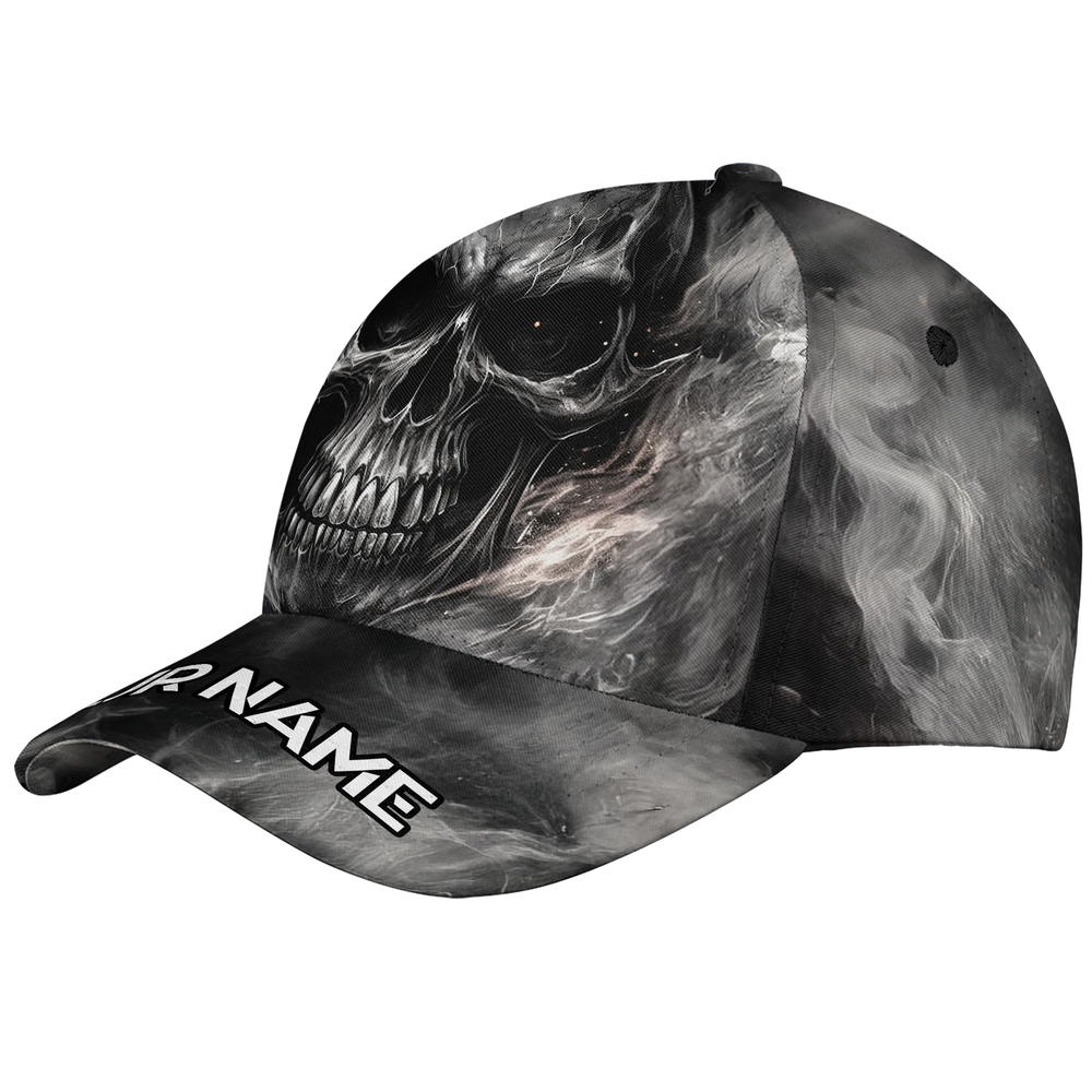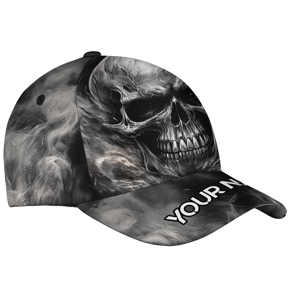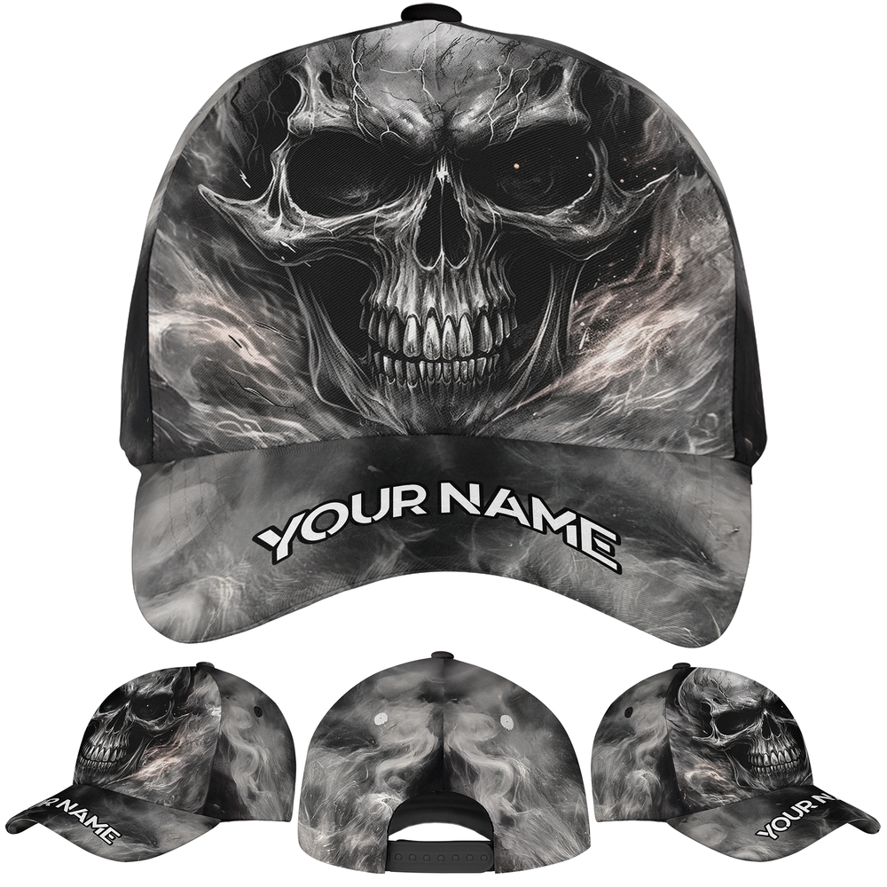 Personalized Name Horror Halloween Skull Baseball Cap, Spooky Skull Baseball Cap, skull-themed baseball cap, baseball horror halloween skull cap, custom name horror halloween skull baseball cap, horror halloween skull baseball cap for men, horror halloween skull baseball cap for women, horror halloween skull gift hat, personalized spooky skull baseball cap * Product details : A custom all over print baseball cap can be a bold accessory for your outfit. It is not only fashionable but also comfortable to wear, even under the scorching sun. Structured 5-panel mid-profile baseball cap with a seamless front, plastic snap closure on the back for a custom fit, a soft sweatband inside for extra comfy, and a sturdy plastic pre-curved visor. Light-weight polyester fabric is suitable to keep the head cool even under hot weather. A hard buckram is added to the front panel, creating forms and helping to hold its shape under the harshest condition. Eyelets are reinforced and stitched in four panels (except for the front) for better ventilation. It also gets a fabric-covered top button. Our custom hat is packaged properly, so it can maintain the perfect shape at all times and offer a classic look to you. One size fits most. Our baseball cat goes well with sporty outfits and casual wear. You can wear the caps on a daily basis when going outside. Even when you stay indoors, it can still enhance your styles and add accents to your outfits. Gift it to your friends, yor dads, and your beloved ones who love sporty looks. * Size chart: * Processing and handling time: This is Print on Demand (PoD) product, it will take 1 – 5 working days for production. Items which have QC problems may need more time for production. * Shipping/ Transit time: Domestic order is expected to deliver within 5-10 business days. International order is expected to arrive within 7-15 working days. * Cancellation: We can only accept the cancellation if item is still in processing stage. We have no way to hold item once it is in production stage. Normally items will be moved to production 1 day after purchasing. * Refund/ replacement/ return policy: Please contact us within 30 days after receiving item for any question. Basically, we are not able to offer refund/ return/ replacement due to wrong selection of color, size, changing mind, second thought. Thank you for shopping with us! Listing and template services provided by inkFrog