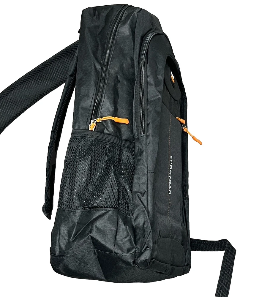 Sport Bag Backpack Black 3 Zipper Closure Compartments 2 Water Bottle Exterior Mesh Pockets Lightweight Travel Carry On Adjustable Straps Light Padding in Largest Compartment Orange Zipper Pull Tabs 18H 13x6 Base inches
