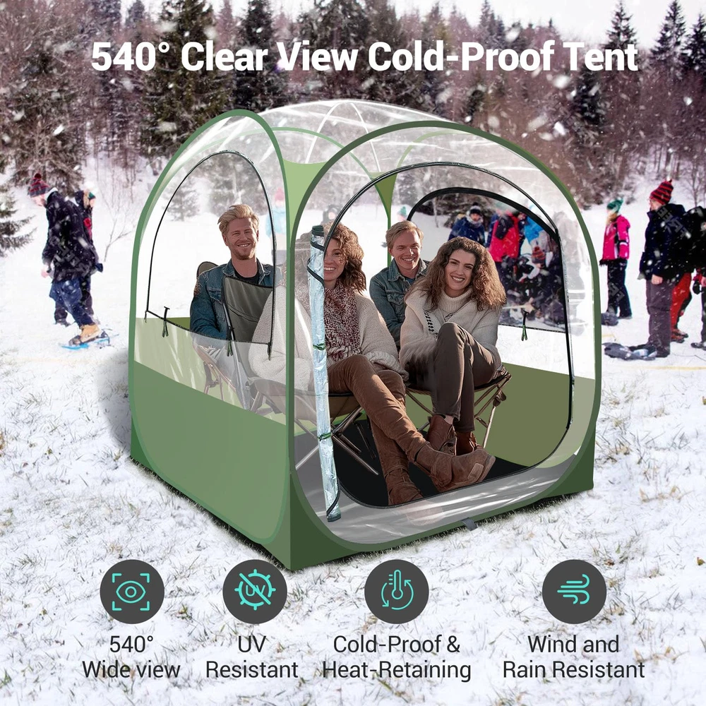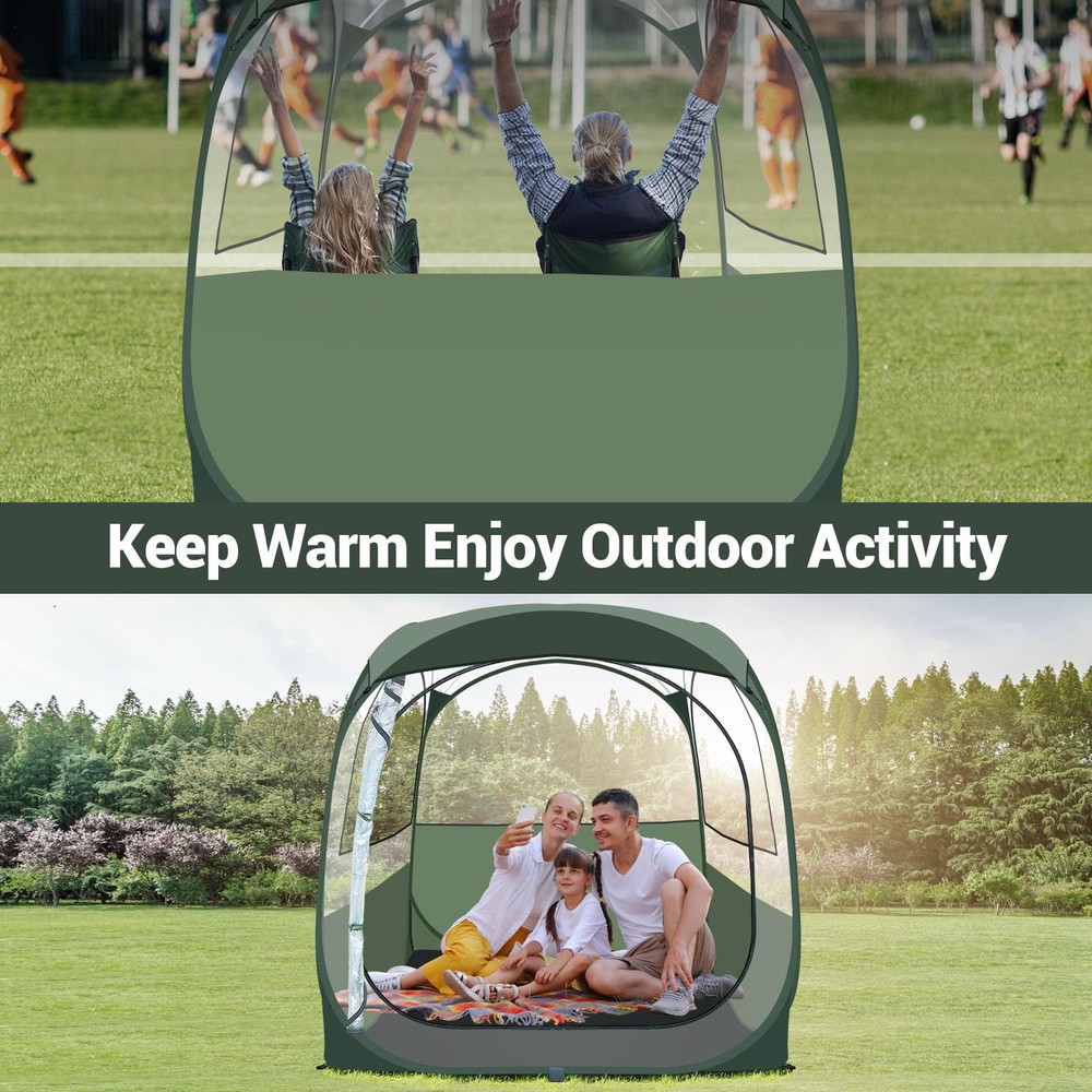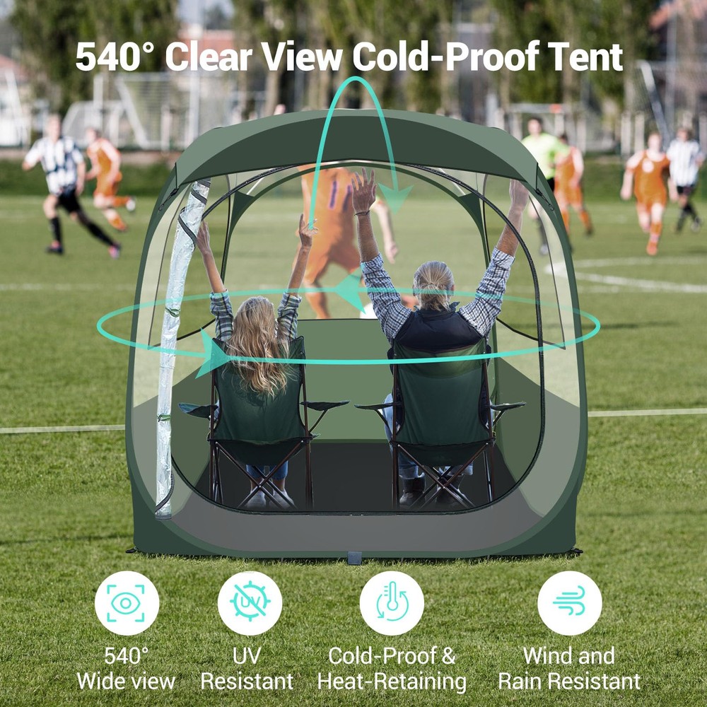 All Weather Sports Tent: Crafted with high-grade, water-resistant PVC and a PE floor, our sport tent ensures you stay dry and protected no matter the weather. The top rain cover and UV 50+ protection shield you from harsh sun rays and unexpected rain showers. Spacious Accommodation: Our weather 4 person pod tent measures 63"L x 63"W x 63"H, comfortably fitting 4-6 people, making it ideal for families or groups. Enjoy the game or the great outdoors together with ample room for everyone. Unparalleled 540-Degree View: Experience the ultimate viewing experience with our pop-up clear tent, designed with ultra-clear thick PVC for a full 540-degree panoramic view. Perfect for fans who don't want to miss a single moment of the action, whether it’s sports events, wildlife, or scenic landscapes. Effortless Setup in Seconds: Forget the hassle of complicated assembly! Our bubble tent features an advanced pop-up mechanism that allows for instant setup and easy takedown, letting you focus more on enjoying your outdoor activities. Mesh Ventilation and Privacy: There are 3 breathable vents with PVC and mesh on the two side windows to provide good ventilation in hot weather, both breathable and mosquito proof. Our unique sports pop-up tent design features three water-resistant opaque sides that enhance privacy while maintaining visibility. Ideal for families and groups who value both seclusion and the joy of watching their favorite events in comfort. Lightweight and Portable: Weighing just 17 pounds, our igloo tent dome includes a durable carrying bag for easy transportation and storage. Whether heading to a game, beach, or campsite, it’s perfectly portable for all your adventures. Versatile Outdoor Use: Beyond sports events, this tent is great for fishing, camping, and family picnics, providing a safe and comfortable outdoor haven. It’s also an ideal choice for photographers and nature observers who require a stable, clear view enclosure.