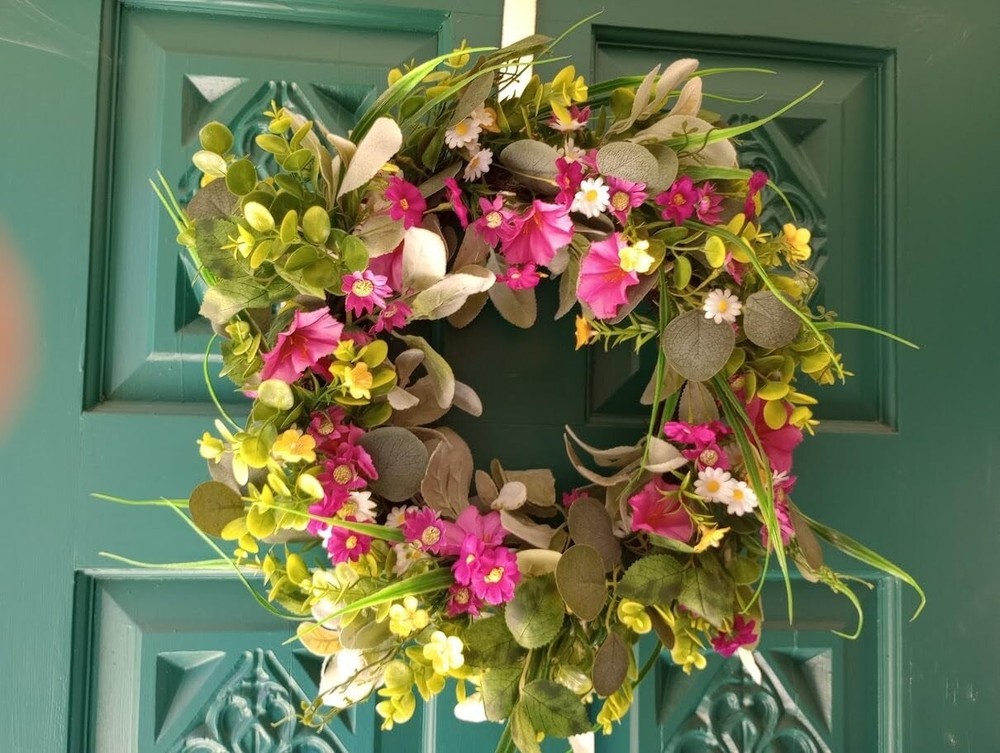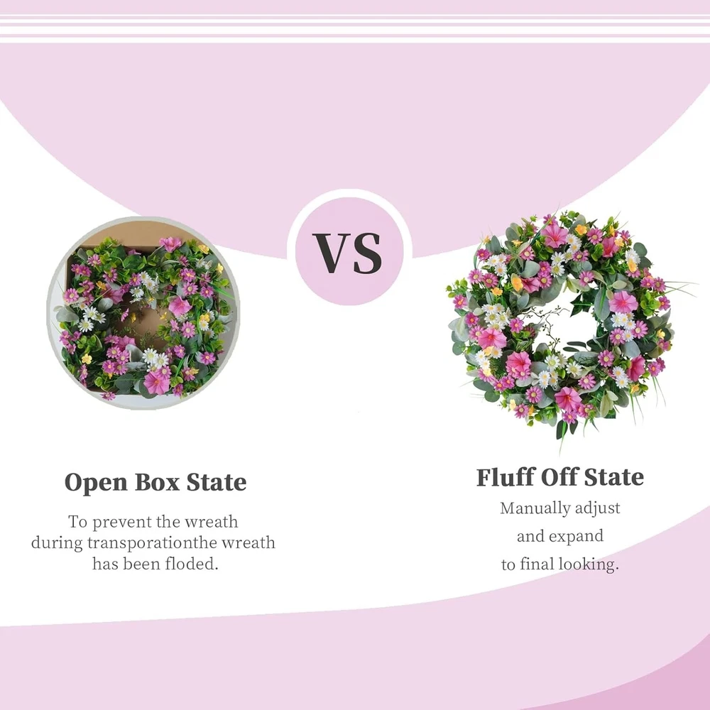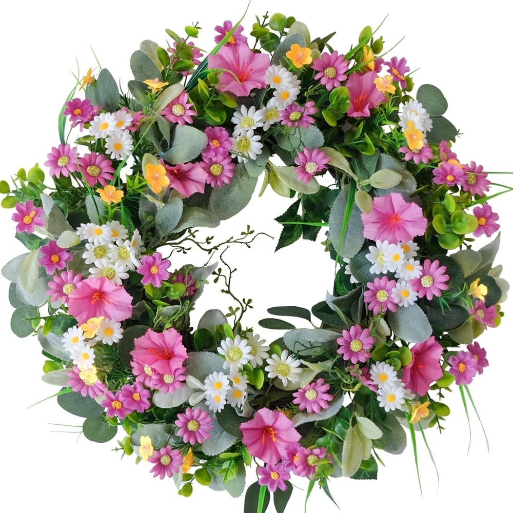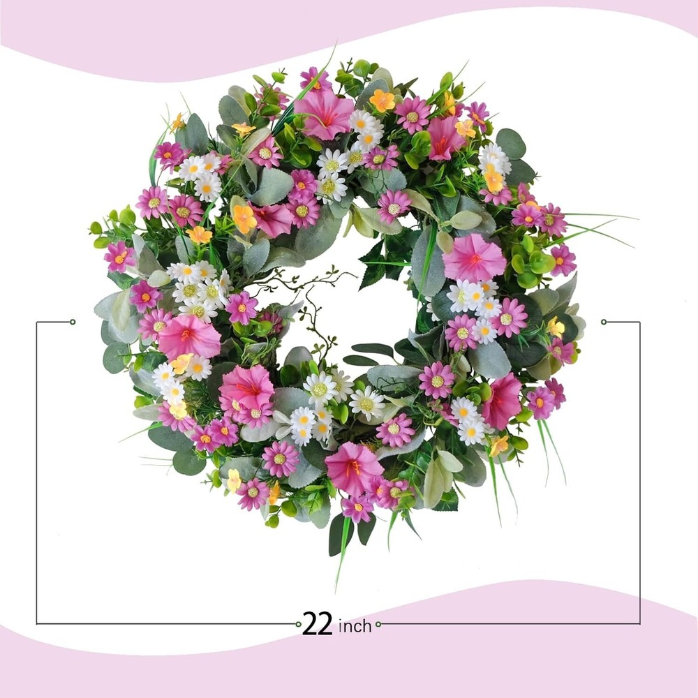 Spring Wreaths for Front Door Summer Wreath with Pansy Flower,Lamb Leaves Spring Wreaths for Front Door Summer Wreath with Pansy Flower,Lamb Leaves Color Multicolored Material Silk Product Dimensions 14"D x 13"W x 2"H SIZE&PACKAGING: Each package contains an enchanting spring wreath. After getting the product, shape it according to the video tutorial and adjust it until you achieve the desired effect. Bend or adjust the branches on the wreath, and arrange the morning glories and daisies with their flower heads facing upwards for the best display effect. The wreath can reach a maximum size of 22 inches. SPRING POEM: This spring and summer front door wreath is adorned with dense pink and white flowers, cute and delicate morning glories, daisies, wildflowers, and supplemented with lamb's ear leaves, boxwood leaves, and other greenery, creating a romantic and sweet appearance. The fresh colors are perfect for spring front door decoration.