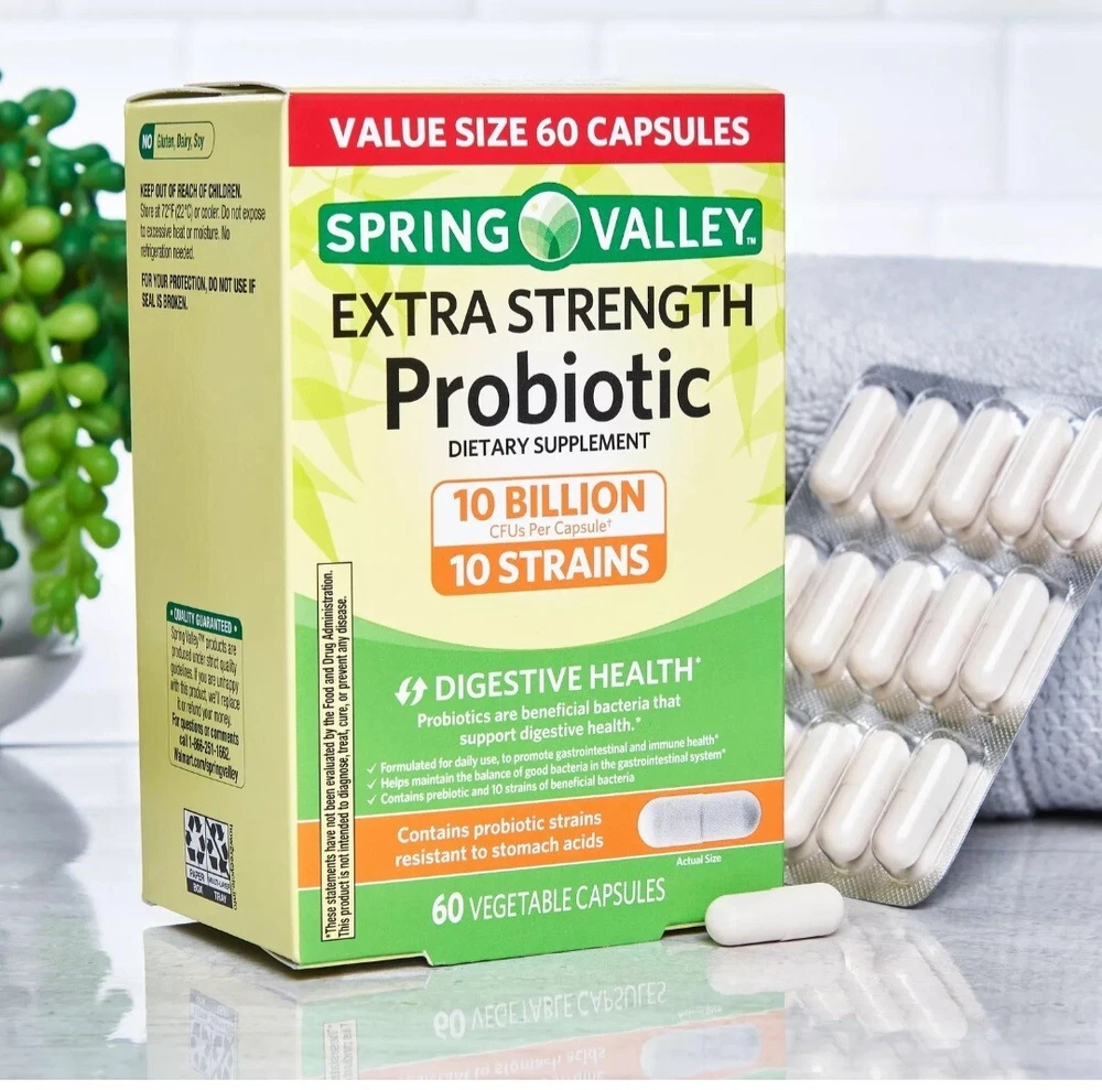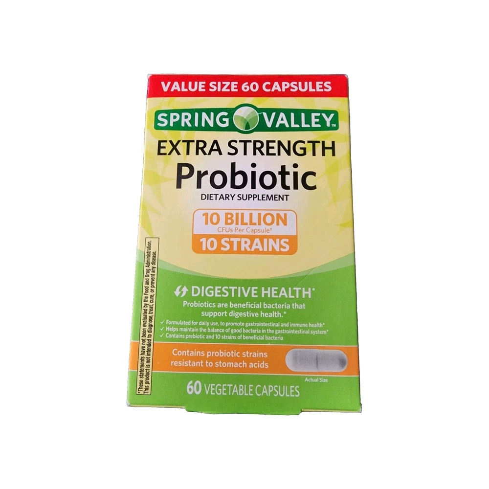 Say goodbye to poor digestive health with Spring Valley Extra Strength Probiotic Vegetable Capsules. Stress, travel, aging, and bad diets can disrupt your body's digestive system balance. These probiotic capsules help support a healthy balance of beneficial bacteria in the digestive system, promoting gastrointestinal and immune health.* This product has been formulated with probiotic strains that are resistant to stomach acids for maximum effectiveness. This value size package includes 60 vegetable capsules with 10 billion CFUs per capsule. With 10 different probiotic strains per capsule, you'll be on the path to fantastic digestive health with just one capsule per day. Keep your body in tip-top shape with Spring Valley Extra Strength Probiotic Vegetable Capsules. Spring Valley understands that living a healthy, balanced lifestyle is the key to being your best self. With an affordable range of products inspired by nature, Spring Valley supports your and your family's health and holistic well-being. ****THIS PRODUCT PACKAGE/BOX MAY HAVE SOME IMPERFECTIONS**