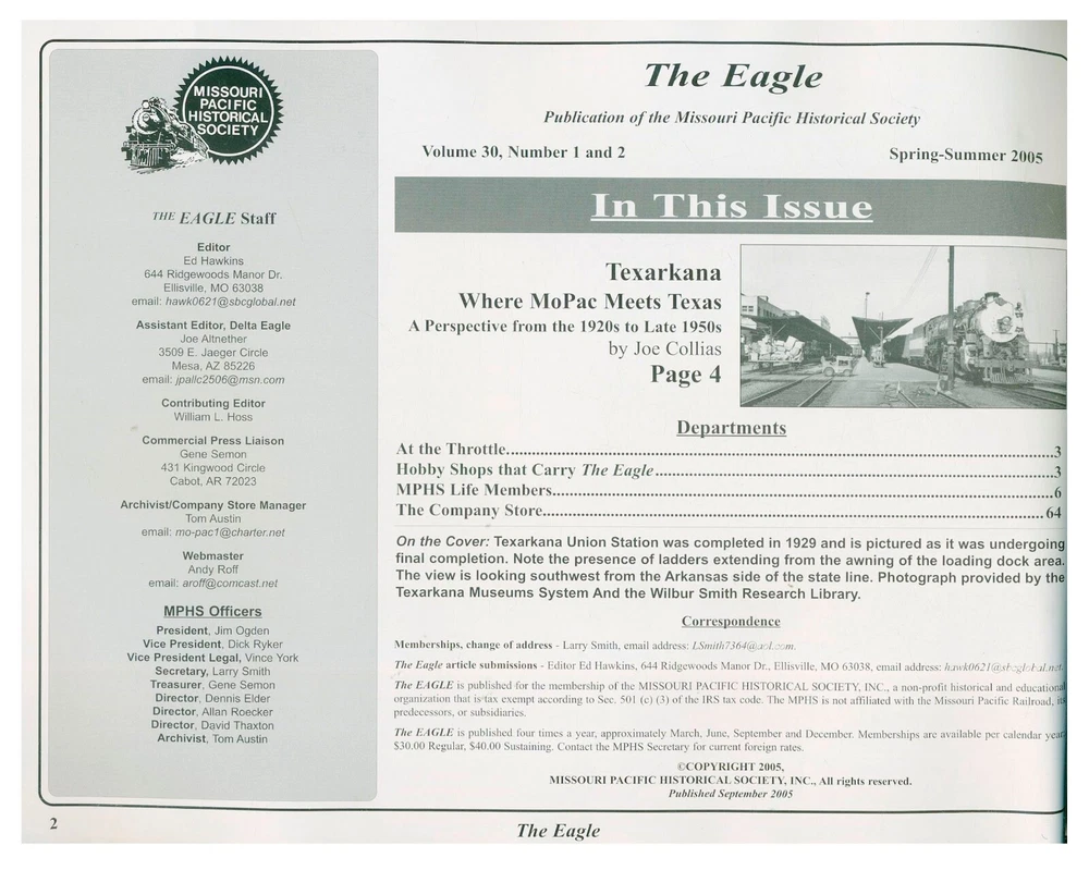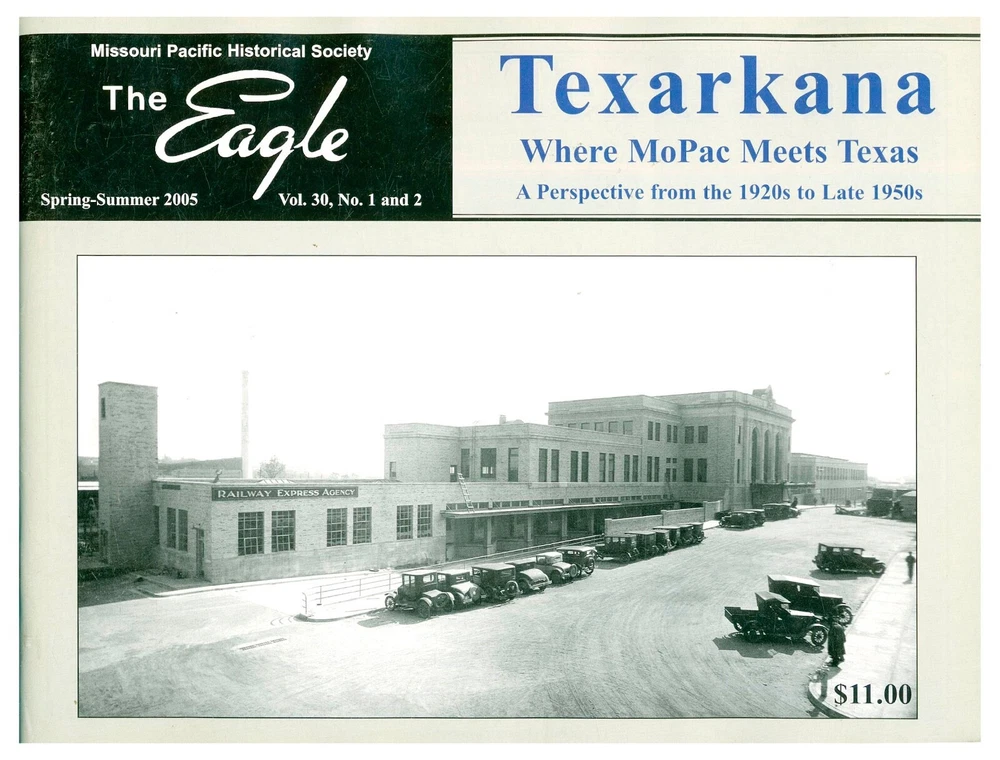 The Eagle Magazine, Missouri Pacific Historical Society. Spring-Summer 2005 Volume 30 # 1/2. 64 pages, b&w photos. Cover article on MOPAC in Texarkana from the 1920s to the 1950s