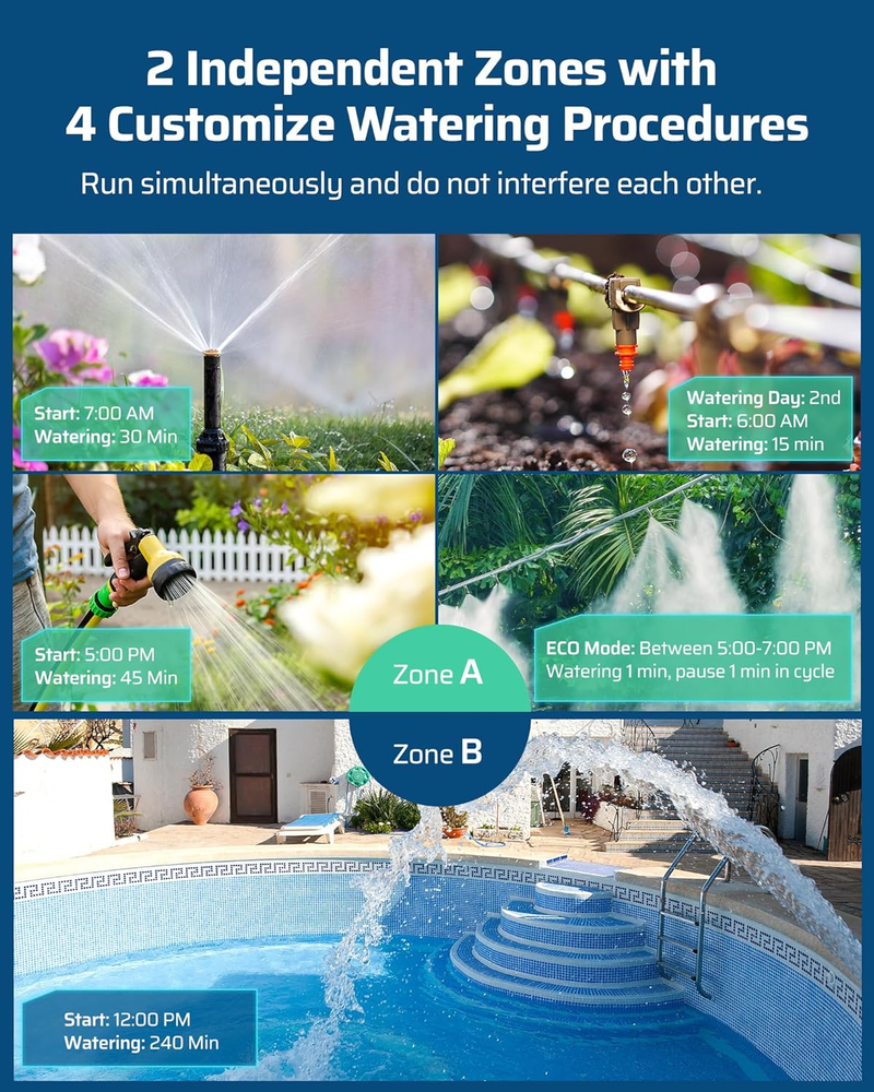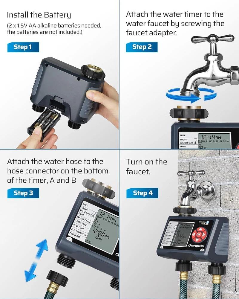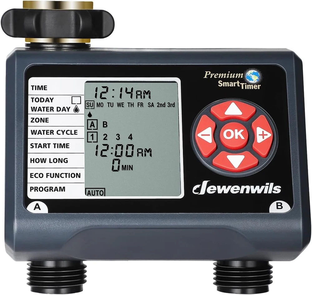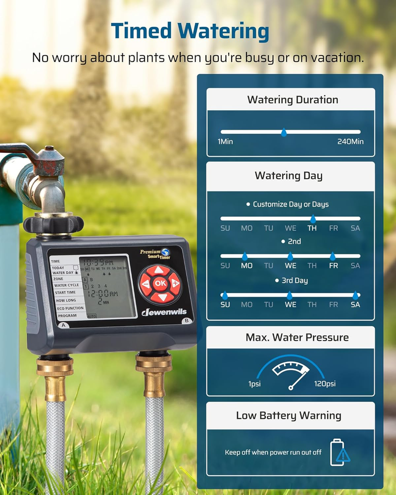 [Easy to Program & Setup] With 3.4" large easy to read LCD screen, details of all functions and working statuses are displayed intuitively, 5 program buttons make your settings easy as adjusting a digital watch, easy to select the days, start time, duration and frequency of your watering schedule, this watering timer can work throughout the summer once set up and programmed [Upgraded Leakproof Design] Pure zinc integrated tap connector is durable and can prevent water leakage during use, it supports standard 3/4 outdoor water faucet; ABS plastic shell is sunscreen and waterproof for outdoor use; the water timer for garden hose won't reduce your water pressure and can withstand water pressure of up to 120 psi [8 Programs for 2 Independent Zones] 2 zones( A and B) can be controlled independently on the same day, each zone has up to 4 watering cycles per day, this water-efficient sprinkler timer can meet your watering needs with different hoses throughout the day, ideal for sprinkler, watering or drip irrigation systems for lawn, garden, yard, potted plants, vegetable, etc. [Multiple Functions] ECO Mode allows connected devices to be on/off for a specific duration and repeat intermittently in your scheduled period, achieving deep plant watering with less consumption; Rain Delay Mode to avoid over-watering plants/flowers during rain and save water; Manual Mode is designed for temporary urgent needs without interrupting the preset auto programs [Hassle free on Vacation] Powered by 2 1.5V AA batteries (not included), the low battery indicator warning helps to replace battery in time, once forget to replace it when you are away on holiday, the hose timer for watering will keep OFF to avoid overwatering to save your garden and conserve water; when power is back on, just reset the current time, the previous watering schedules are still kept Product Description Up to 4 Customize Watering Procedures Each watering plan can set a different start time and duration. Watering intermittently, More scientific and efficient, saving water. With manual mode, you can water your flowers and plants anytime without interrupting your schedule. If in rainy, you can activate this mode to pause programming for 1-6 days to avoid over-watering 1 Automatic Watering 2 Unique Eco Function 3 Manual Watering 4 Rain Delay Dual Zone Water Timer, run simultaneously without interfering each other Mesh filter Added metal filter that can eliminate 99% of water impurities and prevent them from entering the interior to create blockages Upgraded Leakproof Design Pure zinc integrated tap connector is durable and can prevent water leakage during use Waterproof Battery Compartment The internal rubber ring around the battery tray protects the battery from moisture Big LCD Screen With 3.4" large easy to read LCD screen, details of all functions and working statuses are displayed intuitively 1 Garden Watering 2 Drip lrrigation 3 Lawn Sprinkler 4 Mist System More Choices about Dewenwils Water Timer Add to Cart Customer Reviews 4.1 out of 5 stars 1,737 4.1 out of 5 stars 1,737 3.9 out of 5 stars 211 4.0 out of 5 stars 549 4.1 out of 5 stars 384 Price $35.09 $ 35 . 09 — $49.99 $ 49 . 99 $34.19 $ 34 . 19 $58.73 $ 58 . 73 Number of Zone 2 1 3 2 4 Number of Programs per Zone 4 4 4 1 1 Watering Duration 1-360min 1-360min 1-360min 1-360min 1-360min Watering Frequency 1 -7days, 2nd days , 3rd days 1 -7days, 2nd days , 3rd days 1 -7days, 2nd days , 3rd days 1h-12h; 1 day-7 days 1h-12h; 1 day-7 days Water Pressure 120 PSI 120 PSI 120 PSI 120 PSI 120 PSI Top Connector Material Pure Zinc Pure Zinc Pure Zinc Pure Zinc Pure Zinc