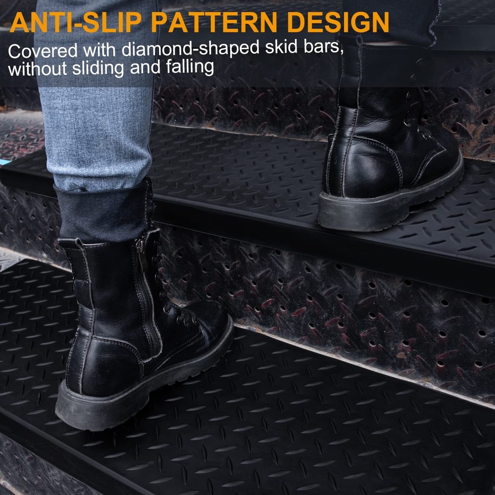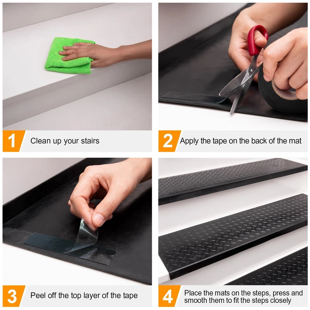 Spurtar Rubber Stair Treads 30" x 10" 6PCS, Non-Slip Outdoor Rubber Stair Treads for Wooden Steps with Nosing for Concrete Marble Tile Metal Steps, Black Product Details Size: 30*10"-6Pack Color: Diamond Black Number of Items: 6 Brand: Spurtar MPN: HFM000206 UPC: Does not apply EAN: Does not apply Brand: Spurtar Size: 30*10"-6Pack Material: Rubber Item Weight: 6 Kilograms Pile Height: Low Pile Product Dimensions : 30 x 10 x 0.1 inches; 13.23 Pounds Item model number : HFM000206 Date First Available : May 14, 2022 Manufacturer : Spurtar Country of Origin : China Best Sellers Rank: #40,448 in Tools & Home Improvement (See Top 100 in Tools & Home Improvement) #80 in Staircase Step Treads #80 in Staircase Step Treads Customer Reviews: 4.4 4.4 out of 5 stars 715 ratings Suitable Universal Size: Spurtar stair treads non slip come with a size of 30"x10" with 0.1 of thickness. Large size increases safety by covering a larger stair surface with no-slip rubber stair treads for stair steps, you can also cut the rubber mat to fit the exact dimensions you need Sturdy Adhesive Tape: High-quality adhesive tape comes with a package. The adhesive tape is easy to attach by tearing off, and firm. The rubber stair rug mat can be fitted firmly with home steps such as grips tile, wood, concrete steps, etc. Sunscreen & Waterproof: Made of high-quality natural rubber, without excitant odor. Our stair nosing non slip pad is sunscreen and waterproof. You can also use it for indoor and outdoor stairs. With high temperature and oxidation resistance, this stair trim stair tread can last longer Easy to Install & Remove: This rubber stair tread is convenient to install and you only need to clean your stair steps and stick the staircase treads with adhesive tape. The adhesive tape used for these stair treads nonslip can easily be removed