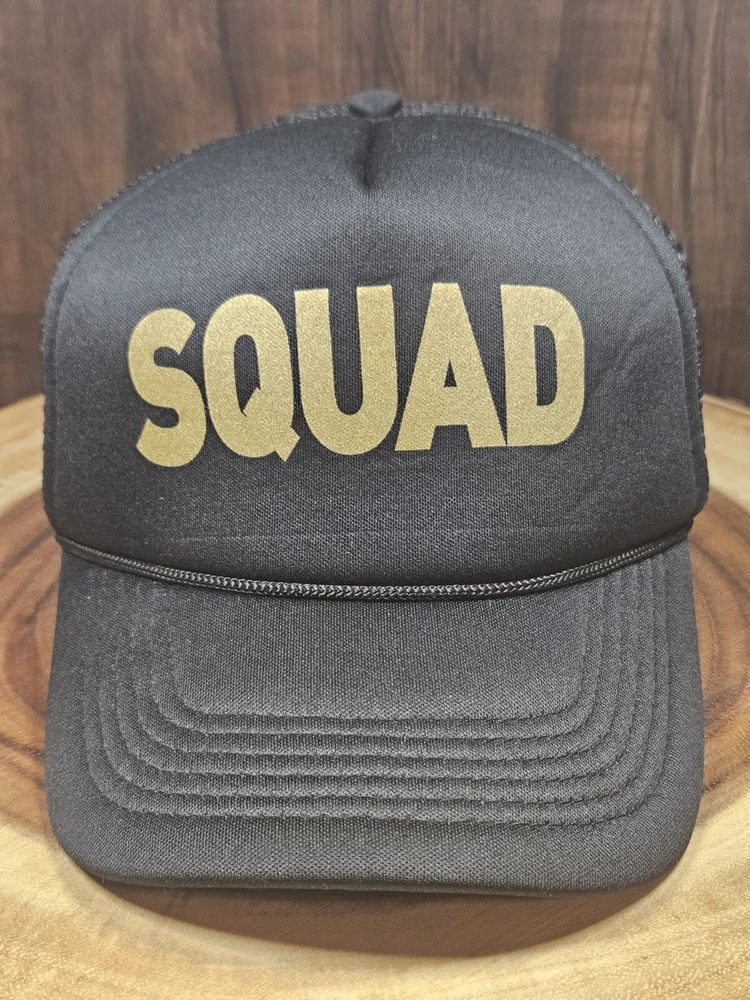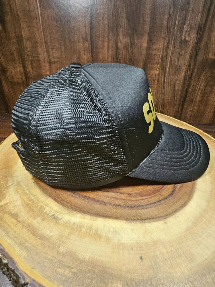 This stylish and versatile Snap-Back trucker hat is a must-have for any fashion-forward man. With a solid black color and gold accents, this hat is perfect for any occasion, whether it's a casual day out or a business meeting. The adjustable size and breathable mesh back make it comfortable to wear all day long. The hat features a snapback closure for a secure fit and a stylish look. Its streetwear and trucker theme makes it a great addition to any outfit. This hat is perfect for men who want to add a touch of style to their wardrobe.