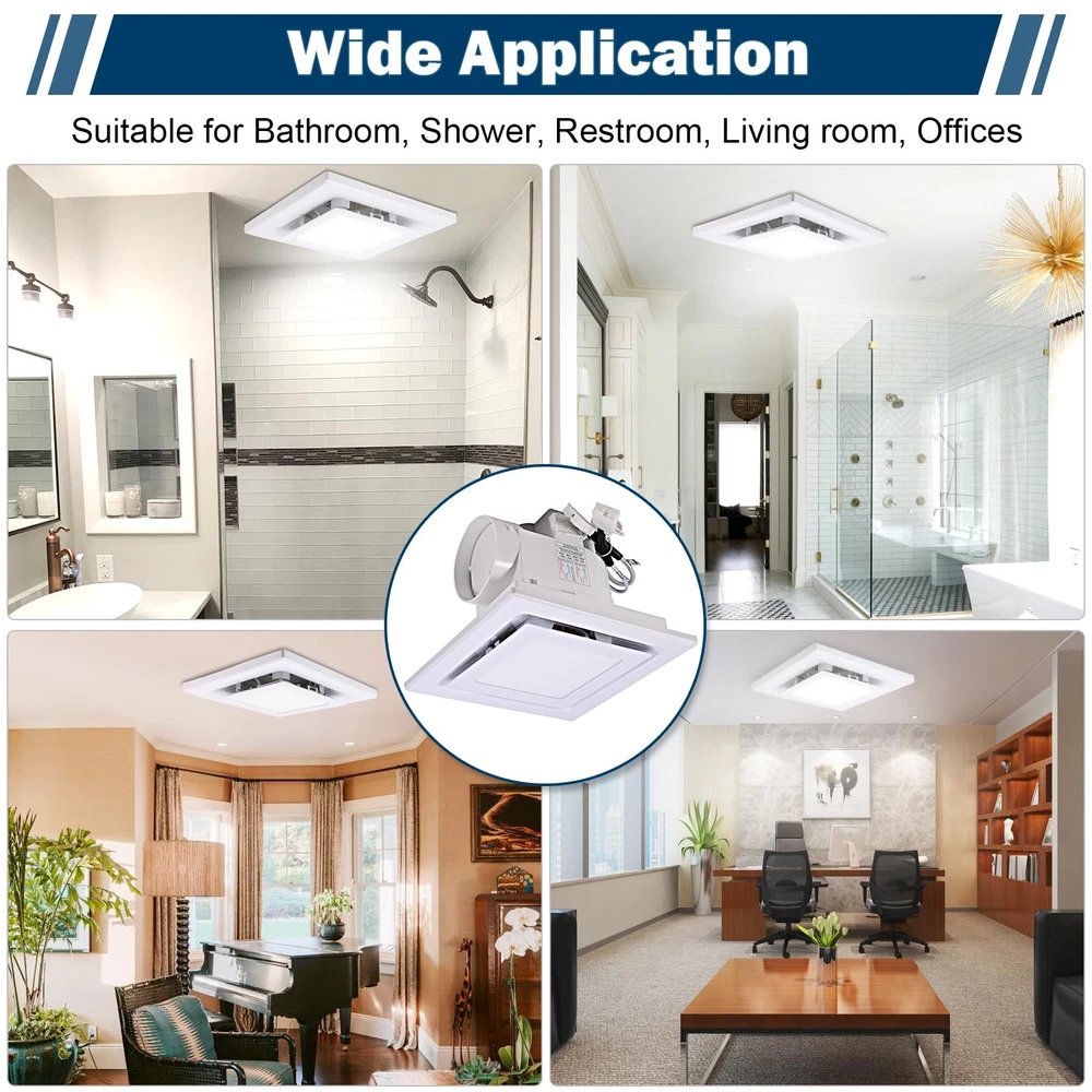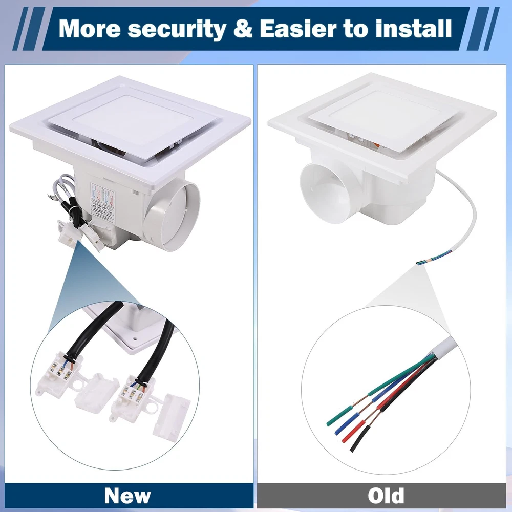 Square Bathroom Exhaust Fan with LED Light, 110 CFM 30W 4 Inch Duct, 110-220V 1.0 Sones Quiet Bathroom Ventilation Fan Light Combo Ceiling Mount Our products have the EU CE certification. The end of the wire is equipped with a junction box, which is more convenient and safe. The wires of the lamp and the fan are independent, which can realize the joint control of the lamp and the fan, and can also be used separately. Super Quiet & Big Suction: EC Draught Fan, 1.0 Sones, exhaust fans are very quiet when working. 110 CFM, quickly remove moisture and odors from the room. Suitable for Bathroom, Shower, Restroom, Living room, Offices. Product Specification: 25W, 110-220V, 110 CFM, 1.0 Sones, 15W 6000K LED light. Duct Diameter: Ø4.0 inches, Panel: 10 x 10 inches, Mounting Hole: 7.8 x 7.8 Inches. Confirm the size before purchasing!!! Exhaust Fan & LED Light Combo: Make your bathroom ceiling look neat & Aesthetics. Effectively removes moisture and reduces sweltering heat, improve air quality while providing lighting. Sturdy & Durable Motor: Made of high quality Copper, long product life, saving energy and Environmental Care. The product is fixed by the combination of screws and buckles, simple installation, firm fixation, convenient to disassemble,conducive to later cleaning and maintenance.