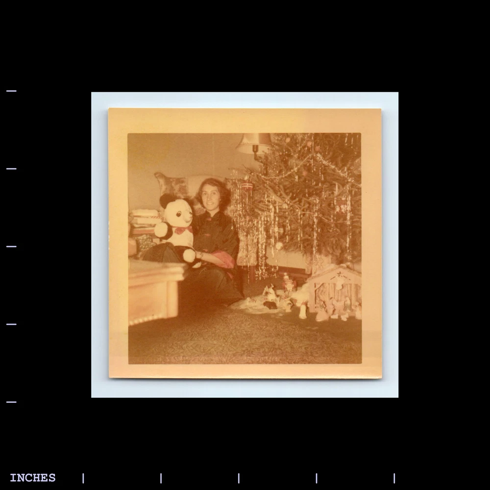 Square Color Photo WOMAN WITH STUFFED ANIMAL NATIVITY SCENE CHRISTMAS TREE