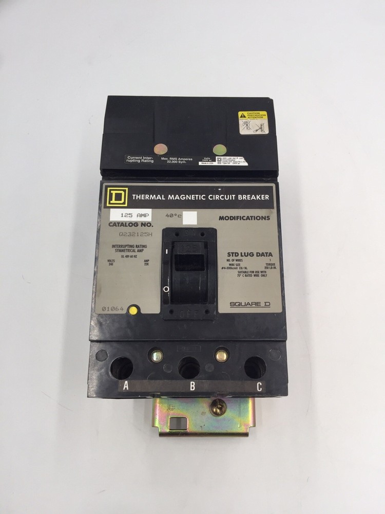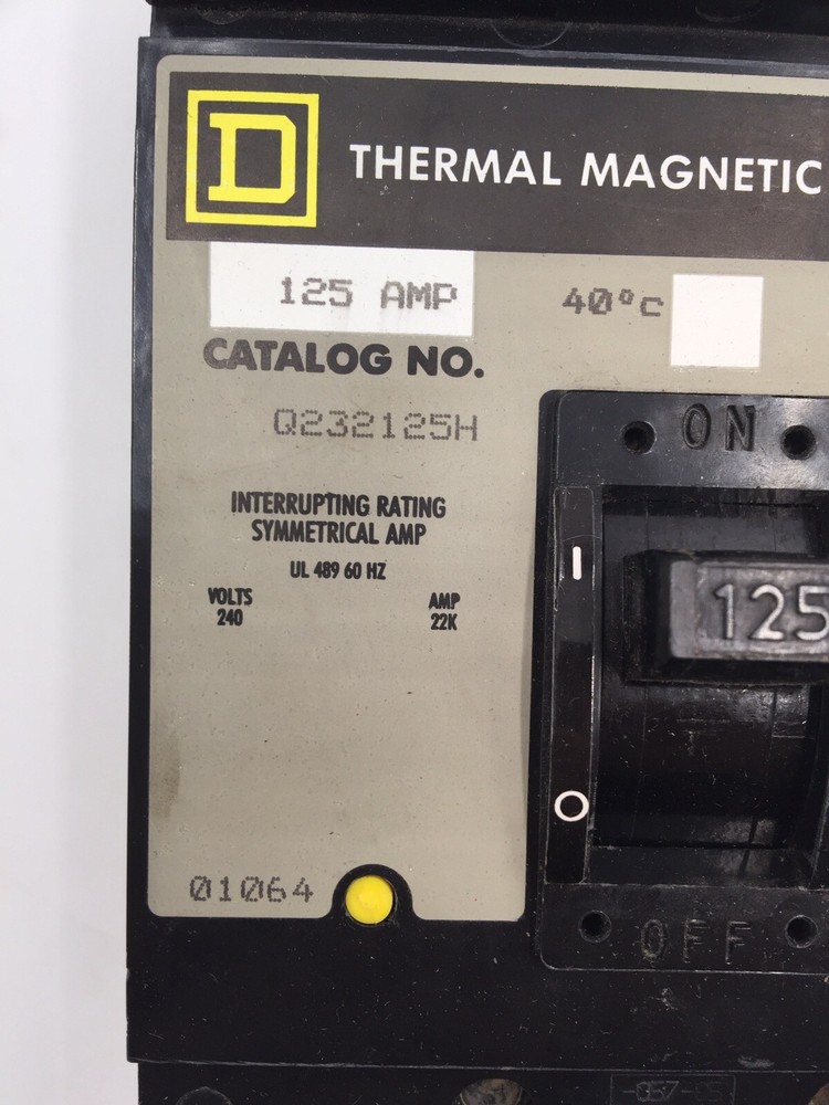 Q232125H Square D, Q2 Series, type Q2, 3P, ABC phase connection, 3PH, 125A, 240V, 22kA@240V, UL listed, high interrupting capacity, I-Line Style Plug-In, complete with non-interchangeable trip, LI - Long-Time and Instantaneous trip functions, Thermal Magnetic, molded case circuit breakers, these breakers are now obsolete. NEW SURPLUS. 1 YEAR REPAIR WARRANTY, SHIPS WITH UPS OR FEDEX, PICK-UP AVAILABLE. WILL SHIP INTERNATIONAL, CUSTUMER PAY SHIPPING. ---CONTACT SELLER--- WE CAN DROP SHIP BLIND.