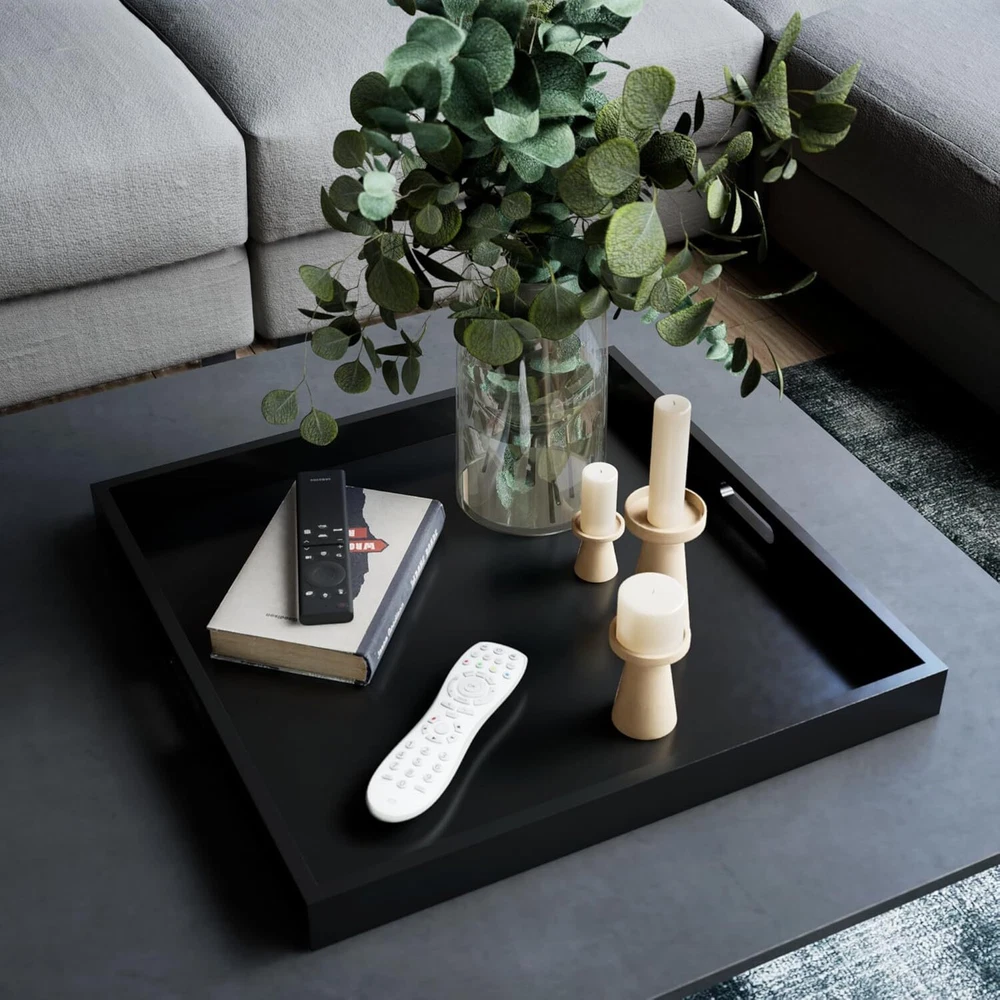 About this item 20" EXTRA LARGE TRAY - Our classic large serving tray with handles is much larger than others wood tray, add extra space works on ottoman/coffee table/bed/couch/chair/living room/bay window etc. or turn your ottoman into a small table, odds and ends storage or hold the tv remotes/ video game controllers/magazines/plants etc. SQUARE CHARCUTERIE BOARD(MUST PUT ON FOOD GRADE PAPER LINERS) - This big square tray can hold enough goodies to satisfy all your guests. at your next party or holiday gathering, you can layout meat, cheese, fruit, bread, crackers on food grade paper liners. it's made of premium high density wood materials to ensure its durability, and all your family and friends will be impressed with your oversized barbecue board creation. DETAIL - Each decorative tray for ottoman with secure 3.4" cutout handles, you can easy to carry of foods and beverages from countertop to kitchen, from office to outdoor patio… anywhere you’d like! The sides are a generous 2" tall, which helps prevent spillage or falling dishware, and without any exposed nails, won't slide around to protect your ottoman. it will be a welcomed addition to your home! MODERN & EASY CLEAN - The matte white / black finish gives it an elegant and simple look with a modern appeal that can be used to display decorative items, they fit well with most home decor styles and tastes, and are very easy to clean, just wipe with a dry cloth and your new tray for ottoman coffee table will change the way you think about presentation and serving guests!