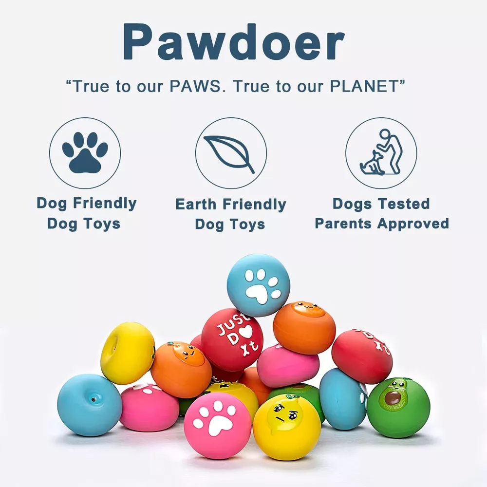 Dimensions: Each ball measures 2.2 inches in diameter and 1.3 inches in height, making them a great size for cats, puppies and small medium dogs. Not suitable for large dogs or aggressive power chewers. These balls are soft and squishy, gentle on teeth and have funny patterns printed on them with a variety of playful colors. Great for bringing to the dog park, using in the backyard or for entertaining your dog in the house. Your dog is sure to love playing fetch with these balls Donut Shaped Dog Toy Balls: The balls are flat on the bottom, more donut shaped rather than a round ball. Since the ball is flat on side, they bounce differently than a round ball. It has an unpredictable roll and bounce, and even small dogs can grab these toys in their mouths easily or catch in mid-air. The dog toy balls multi-pack comes with a variety of bright colors that are highly visible and ideal for both indoor and outdoor fun Squeak & Float & Bounce: Designed with a built-in squeaker that creates sounds comparable to the sound of prey that's frightened or injured, which may ignite their innate wolf-like drive to keep biting and chasing during games of fetch, toss, and catch. Due to the buoyant design, our squeaker dog toy ball can float at the lake or pool. The balls are donut shaped rather than a round ball, easy for your dog to pick up. Depending on how it lands, it can bounce erratically Non-Material & BPA Free: Made with natural latex rubber, Criterion of Detection US FDA CFR 21 (Rubber Articles) / EU CE EN71 ( Toys ). Non-safe material, free from nasties like BPA, Phthalates, no smell and other icky things you don't want in your pet's mouth, soft enough on your dog's mouth, provide the safest pet toys for your furry canine friend. squeaker balls combine your dog's favorites, a toy ball and a squeaky toy, into exciting fetch toy! A great option for both land or water play A Reminder for Dog Lovers like Us: Being pack animals, dogs are not built to spend time alone. A squeaky toy ball is an item dogs love specifically because they can chase it well, it can fit in their mouth easily, they can spot it. For puppies, toys are not a luxury, but a necessity. Let's face it, no indestructible dog toys exist. We've all met dogs who chew through anything! An unbreakable ball just doesn't exist. Bad dogs destroy shoes, good dogs destroy toys. Just buy more toys!