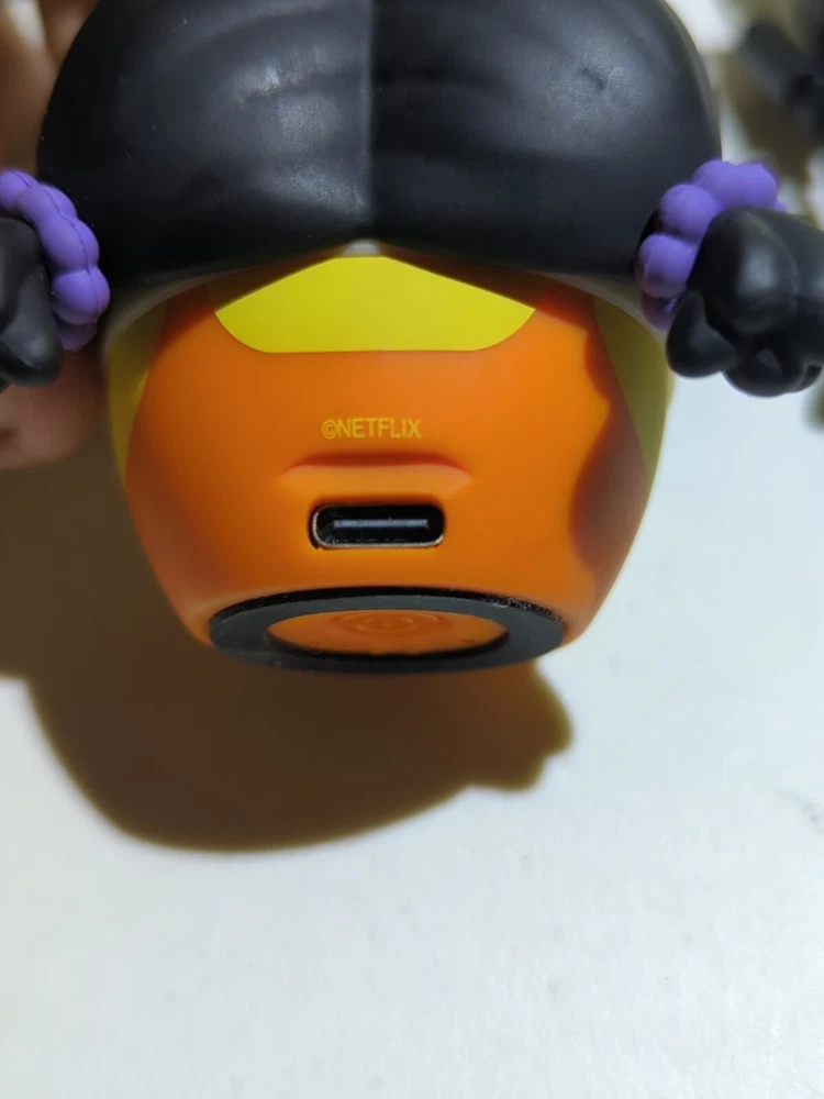 The Squid Game Bitty Boomer Bluetooth Speaker is a standing speaker designed in a multicolor scheme featuring characters from the popular show. This collectible item comes with a cable for charging. It has been tested and is confirmed to be in working condition, providing a convenient and fun way to enjoy your favorite music or audio content. The Bluetooth feature allows for wireless connectivity to various devices for easy playback.