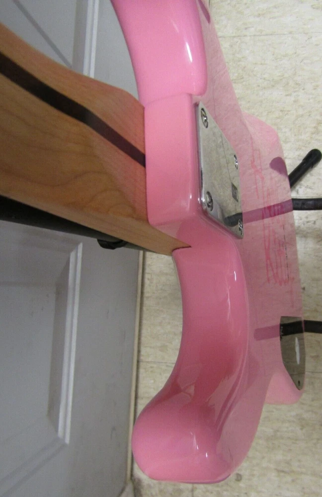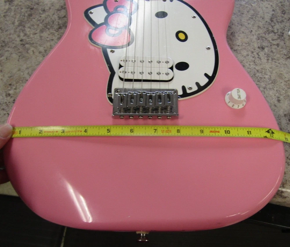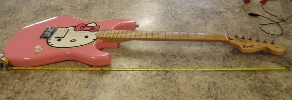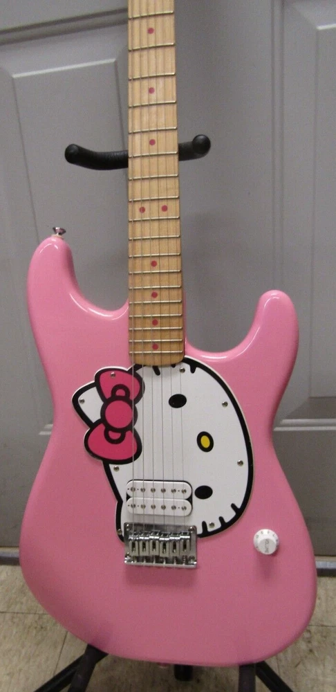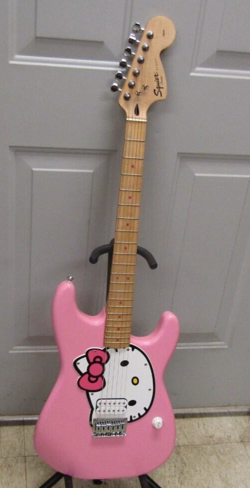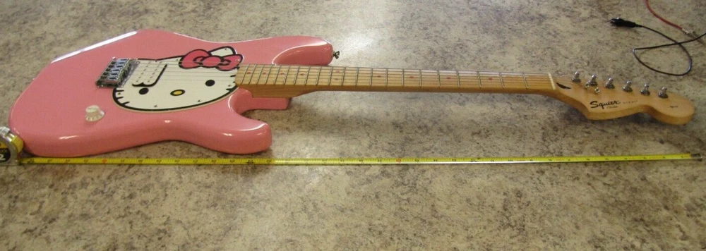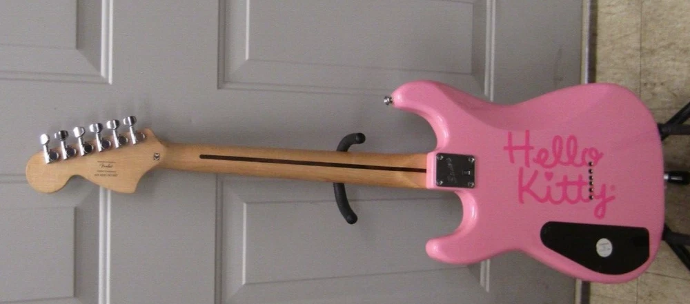 Squier Affinity Series Hello Kitty Strat Pink Electric Guitar Fender Strat, does have some dings on bottom, the plastic protective covering is on the front and back still, see pictures for condition Hello Kitty® Stratocaster®, Maple Fingerboard, Pink Model #: 0335005570 Case/Gib Bag: None Product Specs Body Agathis Body Finish Gloss Polyurethane Body Shape Stratocaster® Bridge 6-Saddle Standard Strings-Through-Body Tele® with Block Saddles Color Pink Configuration H Control Knobs Black Plastic Controls Master Volume Country Of Origin ID Dimensions 4.00x14.50x44.50 IN Fingerboard Maple Fret Size Medium Jumbo Hardware Finish Chrome Model Name Hello Kitty® Stratocaster®, Maple Fingerboard, Pink Neck Finish Satin Urethane Neck Material Maple Neck Material Maple Neck Shape "C" Shape Number of Frets 21 Nut Material Plastic Nut Width 1.61" (40.9 mm) Orientation Right-Hand Pickguard None Pickup Configuration H Pickup Switching None Position Inlays Black Dot Refinement Neck Material Maple Scale Length 25.5" (64.77 cm) Series Hello Kitty® String Nut Plastic Strings Fender® USA 250L Nickel Plated Steel (.009-.042 Gauges), PN 0730250403 Tuning Machines Standard Die-Cast