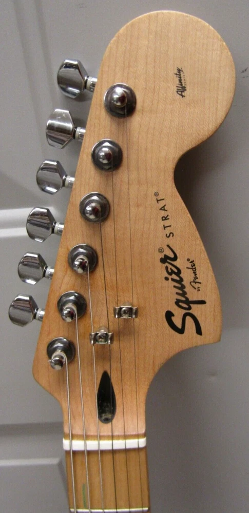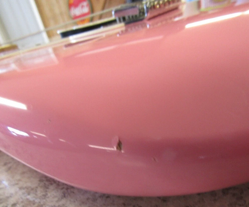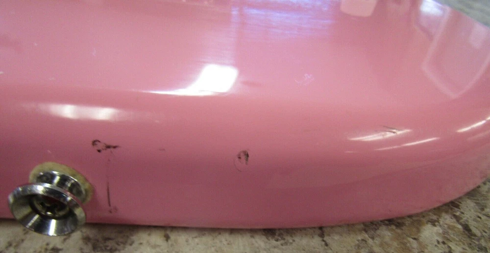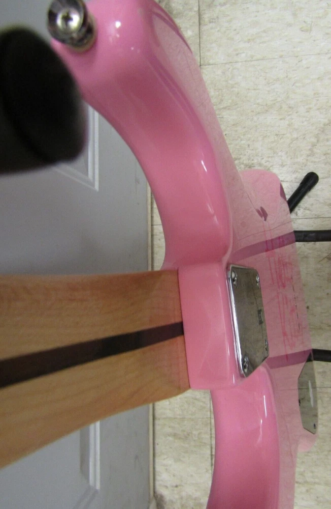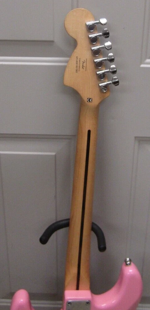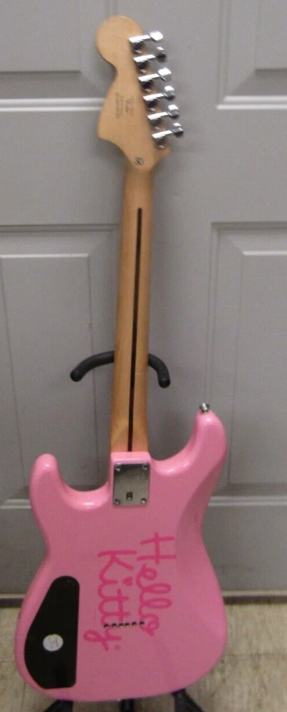 Squier Affinity Series Hello Kitty Strat Pink Electric Guitar Fender Strat, does have some dings on bottom, the plastic protective covering is on the front and back still, see pictures for condition Hello Kitty® Stratocaster®, Maple Fingerboard, Pink Model #: 0335005570 Case/Gib Bag: None Product Specs Body Agathis Body Finish Gloss Polyurethane Body Shape Stratocaster® Bridge 6-Saddle Standard Strings-Through-Body Tele® with Block Saddles Color Pink Configuration H Control Knobs Black Plastic Controls Master Volume Country Of Origin ID Dimensions 4.00x14.50x44.50 IN Fingerboard Maple Fret Size Medium Jumbo Hardware Finish Chrome Model Name Hello Kitty® Stratocaster®, Maple Fingerboard, Pink Neck Finish Satin Urethane Neck Material Maple Neck Material Maple Neck Shape "C" Shape Number of Frets 21 Nut Material Plastic Nut Width 1.61" (40.9 mm) Orientation Right-Hand Pickguard None Pickup Configuration H Pickup Switching None Position Inlays Black Dot Refinement Neck Material Maple Scale Length 25.5" (64.77 cm) Series Hello Kitty® String Nut Plastic Strings Fender® USA 250L Nickel Plated Steel (.009-.042 Gauges), PN 0730250403 Tuning Machines Standard Die-Cast